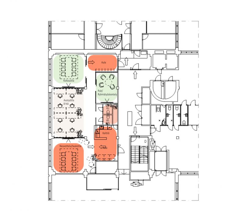 Tilat on tällä hetkellä toteutettu avotilan, neuvottelutilan sekä keittiötilan yhdistelmänä.