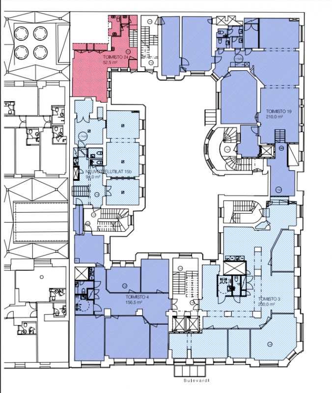 Huippuosoitteessa Bulevardilla tarjolla kaksi kerroksinen noin 107,5 m2 toimitila omalla sisäänkäynnillä. Molemmat kerrokset ovat noin samansuuruiset ja ne on yhdistetty portailla. Tiloissa on 2 avotilaa, 2 wc:tä, varasto ja keittiö.