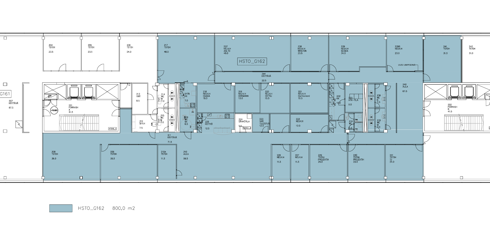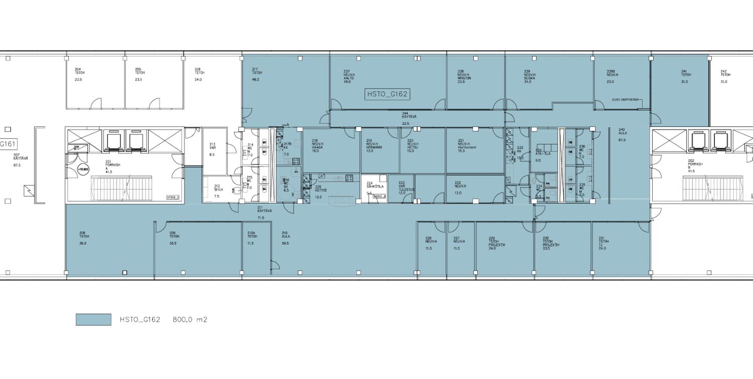 Vapaana monipuolinen 800 m2 toimistotila Sakkaroosin toisessa kerroksessa. Tilaan kuuluu avokonttoria sekä erillisiä työ- ja neuvotteluhuoneita, joissa onnistuu hieman enemmän yksityisyyttä vaativa työskentely. Tähän toimistohuoneistoon kuuluu omat wc-tilat ja keittiöt, sekä useampi esimerkiksi loungeksi sopiva avoin aulatila. Kysy lisää mahdollisuuksista jakaa ja yhdistää rakennuksen tiloja!
