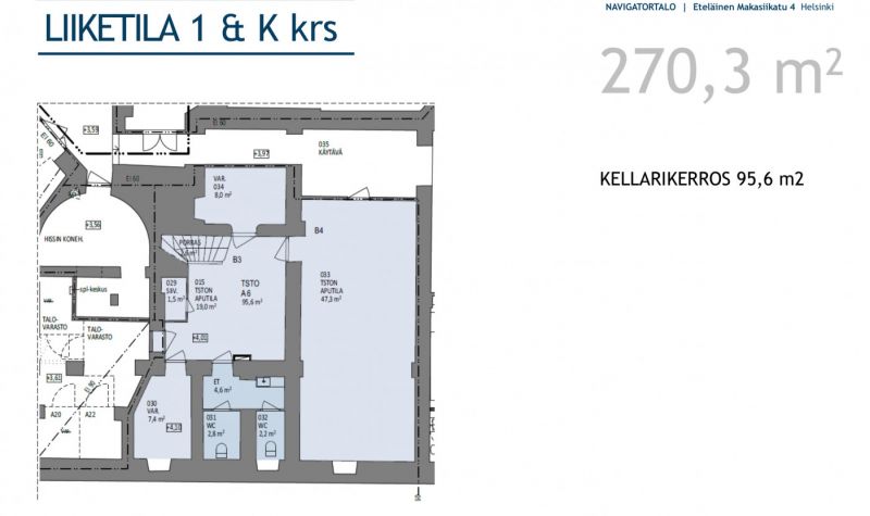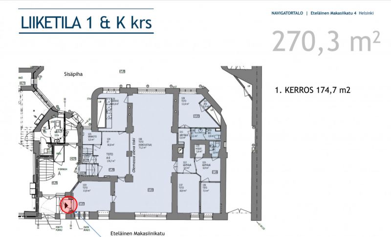 Vuokrataan n. 270m2 liike- tai toimistotilaksi soveltuva tila arvokiinteistössä. Maantasokerroksessa noin 175 m² näyttävää toimitilaa omalla sisäänkäynnillä Eteläiselle makasiinikadulle. Tilassa suuri huonekorkeus ja ikkunat sekä upeita yksitiskohtia. Maantasokerroksesta johtaa sisäportaat alempaan kerrokseen jossa noin 96 m² wc- ja aputiloja. Alemmasta kerroksesta vielä oma ovi yhtiön kellarikerrokseen.