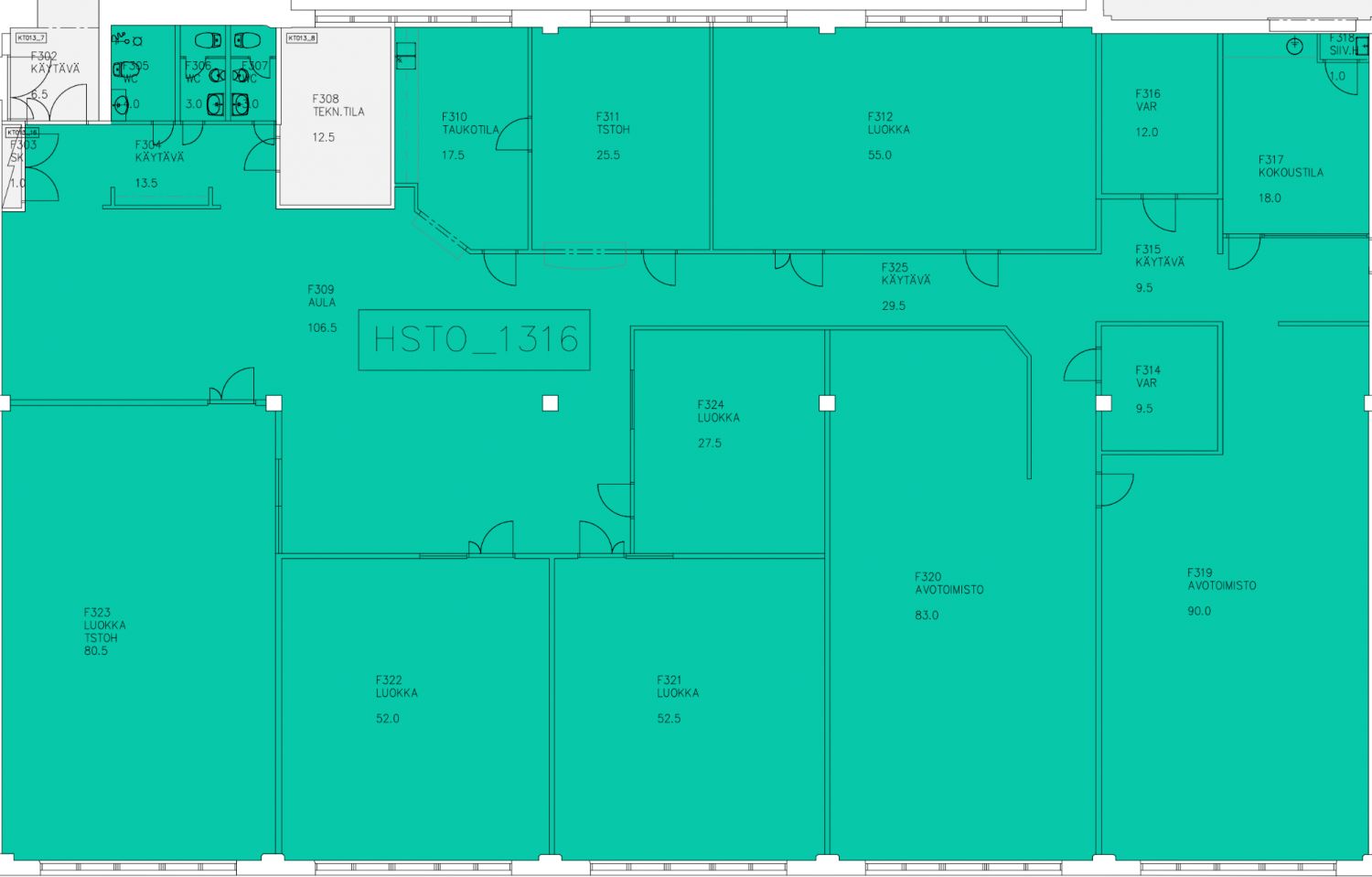 Vapaana kolmannen kerroksen valoisa toimistohuoneisto. Monipuolinen tila koostuu useista erikokoista työtiloista ja -huoneista. Loistavasti vaikkapa koulutuskäyttöön soveltuvaa tilaa voidaan muokata kattavasti vastaamaan uuden käyttäjän tarpeita, vaikkapa avotoimistoksi. Mukavuutta työpäivään tuovat erillinen taukotila, useampi oma WC sekä työmatkapyöräilijöitä ajatellen isona bonuksena oma suihku. Tilaan kulkevan portaikon yhteydessä on pari hissiä.