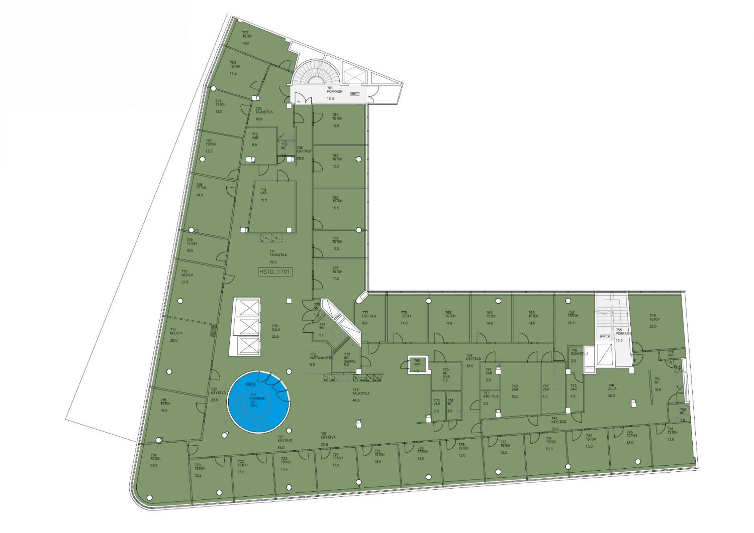 Vapautumassa moderni ja siisti koko kerroksen toimistokokonaisuus. Kuudennessa kerroksessa sijaitsevaan kohteeseen kuuluu suuri määrä erikokoisia työ-, neuvottelu ja varastohuoneita, sekä näitä yhdistävät avarat aulatilat. Kattavat taukotilat lisäävät työmukavuutta, kun taas työmatkapyöräilijät arvostavat suuresti omaa suihkua. Kattavat varasto- ja tukitilat kuuluvat pakettiin, useita WC:itä sekä kolmea hissiä unohtamatta. Nykyinen tilaratkaisu ei ole sitova, vaan tila voidaan tarpeen mukaan myös jakaa useammalle käyttäjälle. Sovi näyttö niin käydään tutustumassa! Havainnollistavat kuvat toimistoista otettu kerrosta alempaa.
