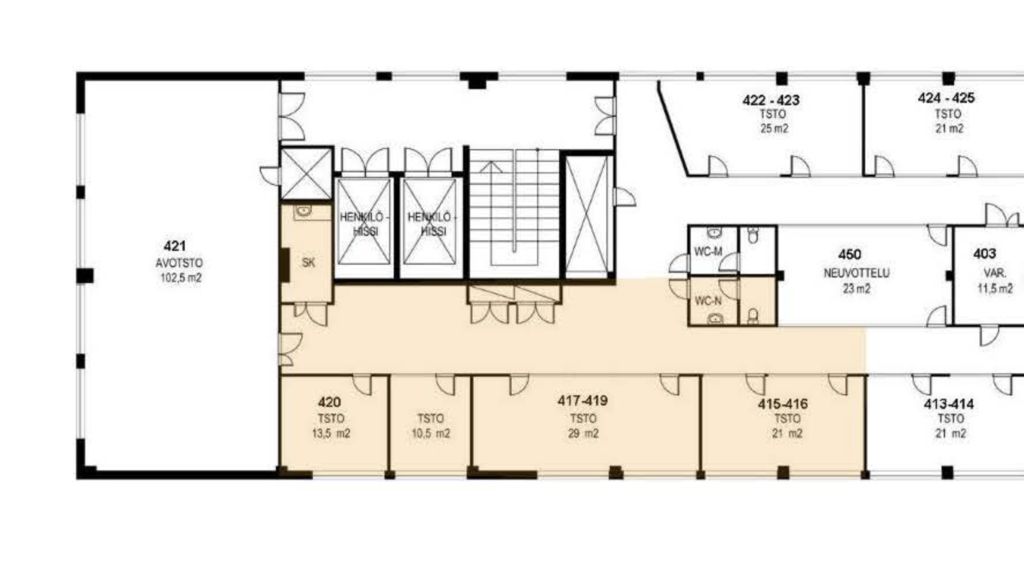 Tämä jäähdytetty 145,5m2 toimistotila sijaitsee kiinteistön 4. kerroksessa, oma sisäänkäynti. Tila koostuu useammasta toimistohuoneesta. Oma wc. Tilat ovat muokattavissa yrityksen tarpeiden mukaan.