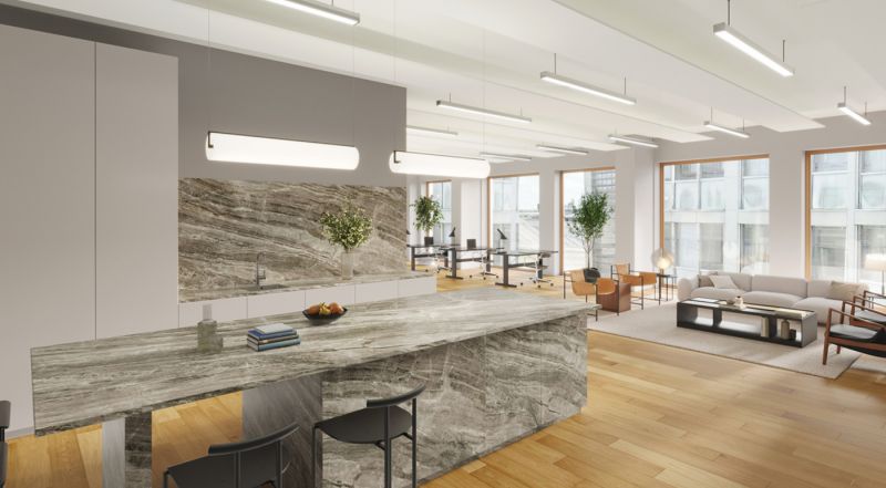 Kuvat ovat visualisointeja tulevasta kiinteistöstä. Visualisoinneissa esiintyy sisustusarkkitehtuurin ammattilaisten luomat design-teemat, joita on mahdollista hyödyntää toimistojen tilasuunnittelussa.
