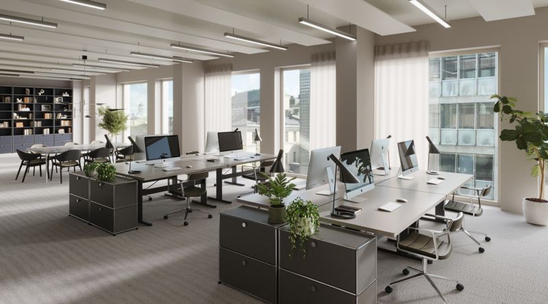 Kuvat ovat visualisointeja tulevasta kiinteistöstä. Visualisoinneissa esiintyy sisustusarkkitehtuurin ammattilaisten luomat design-teemat, joita on mahdollista hyödyntää toimistojen tilasuunnittelussa.