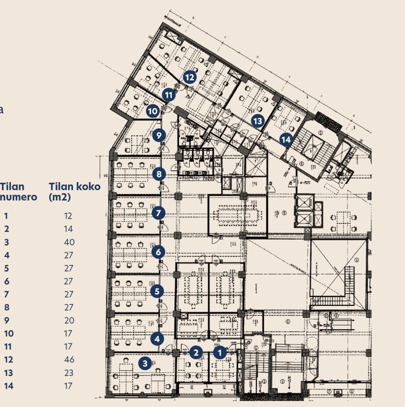 Tila koostuu yhdestä kalustetusta n. 10 henkilön huoneesta. Wc-tilat, neuvotteluhuone ja viihtyisä taukotila/lounge ovat vuokralaisten yhteiskäytössä. Pohjakuvassa tila #12.