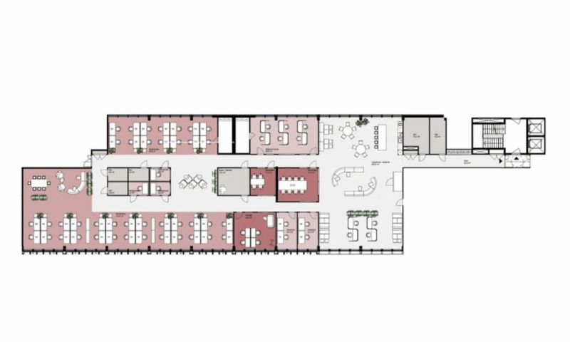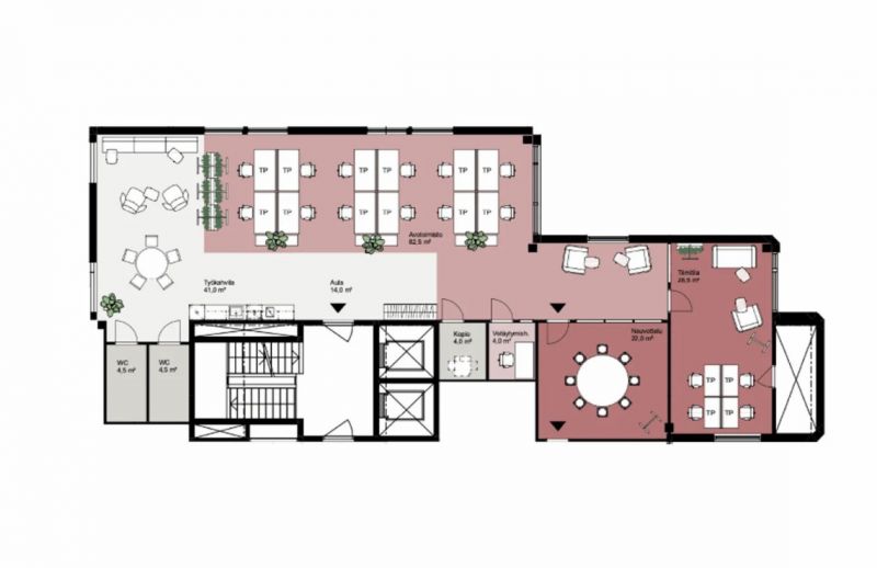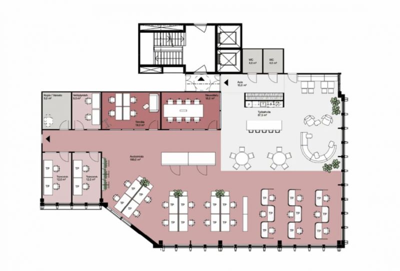 Vuokrattavana 3. kerroksen toimistotilaa, jossa on avotilaa, eri kokoisia työ- ja neuvotteluhuoneita sekä omat wc- ja keittiötilat.