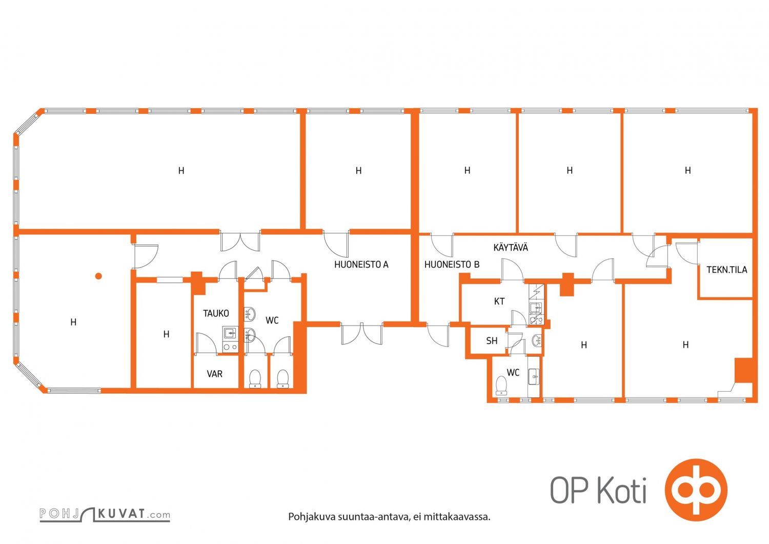 B: aula, neljä toimistohuonetta joista yksi todella iso, käytävä, taukotila keittonurkalla jonka yhdteydessä varasto, erillinen vessa.