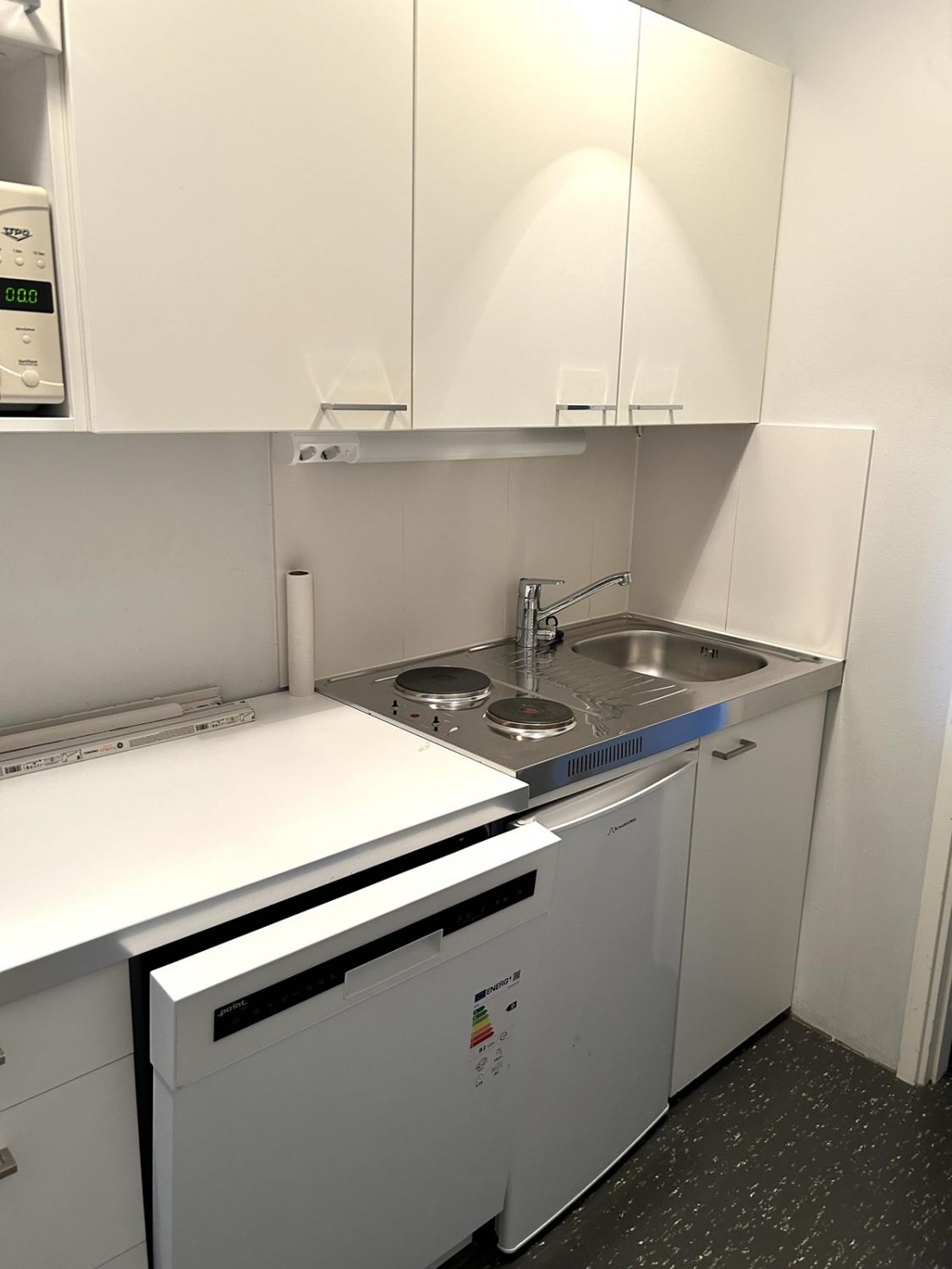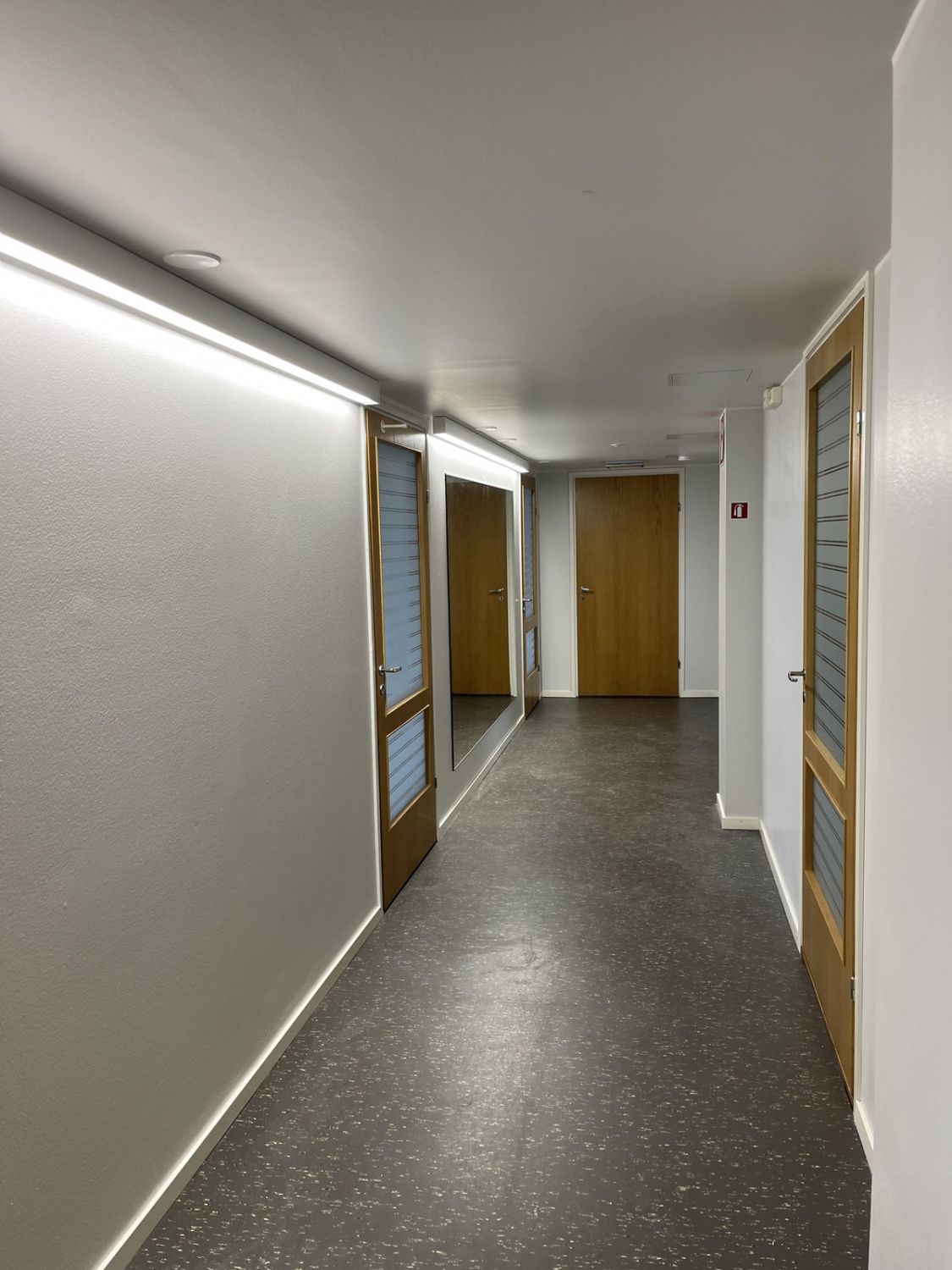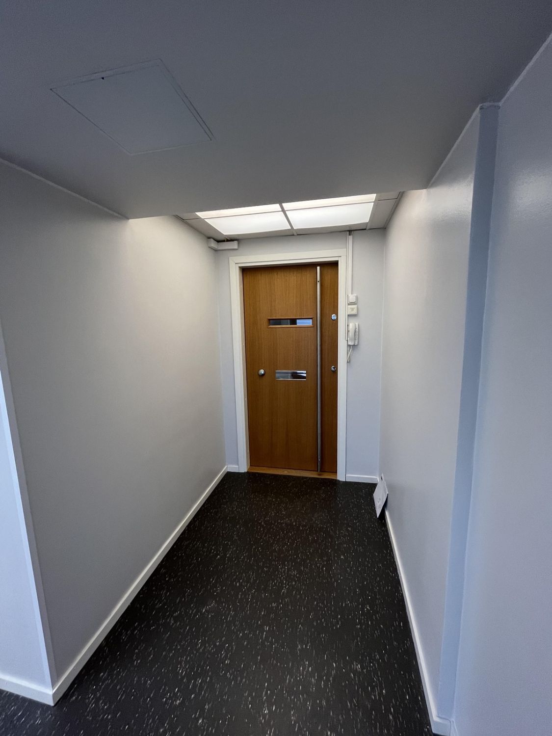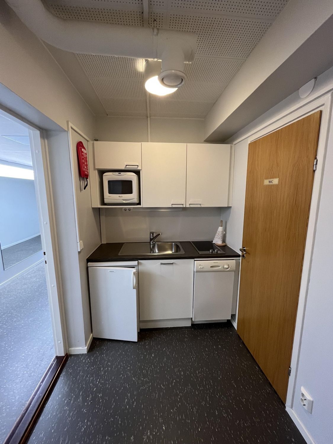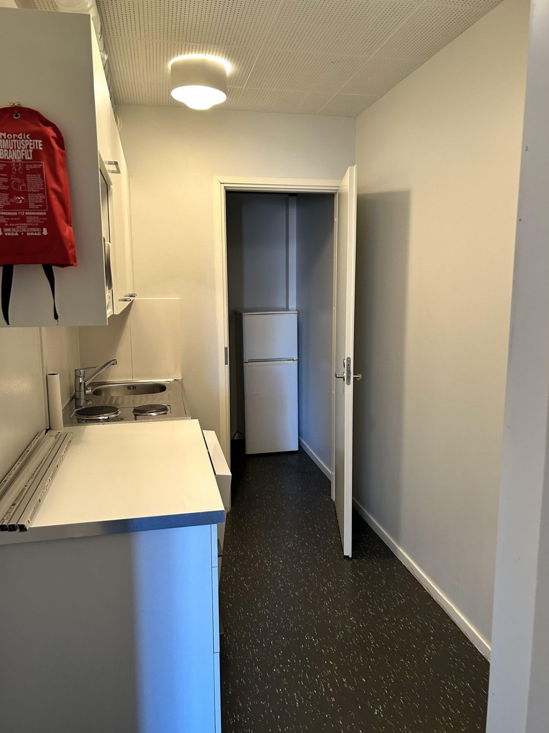 A: viisi tilavaa toimistohuonetta, käytävä, taukotila keittonurkalla, jonka yhteydessä vessa ja erillinen suihku.