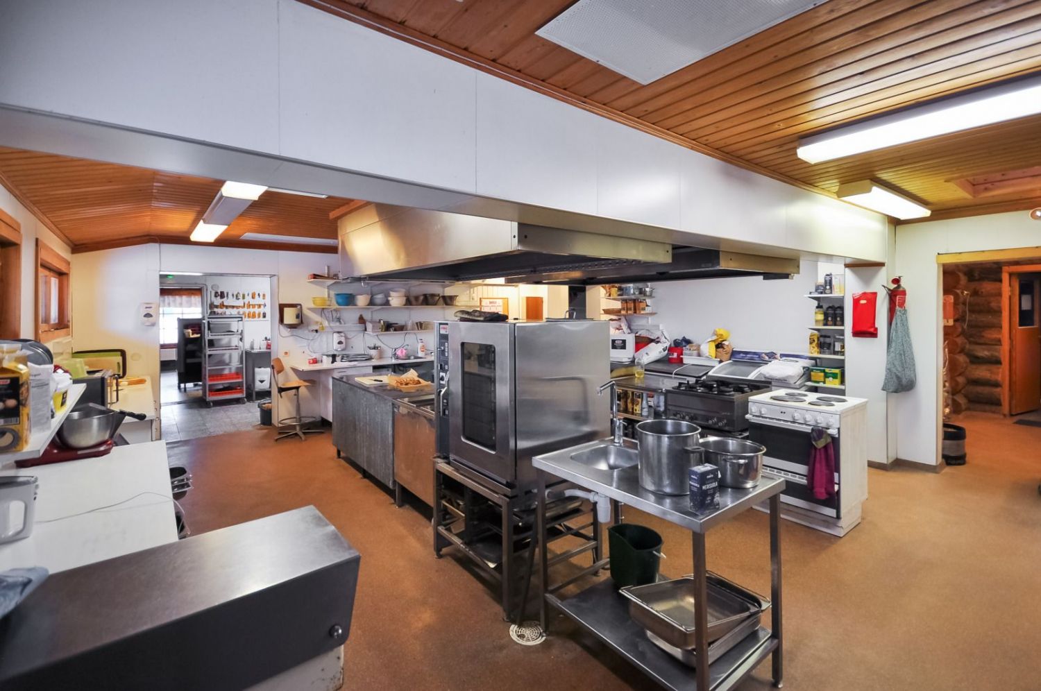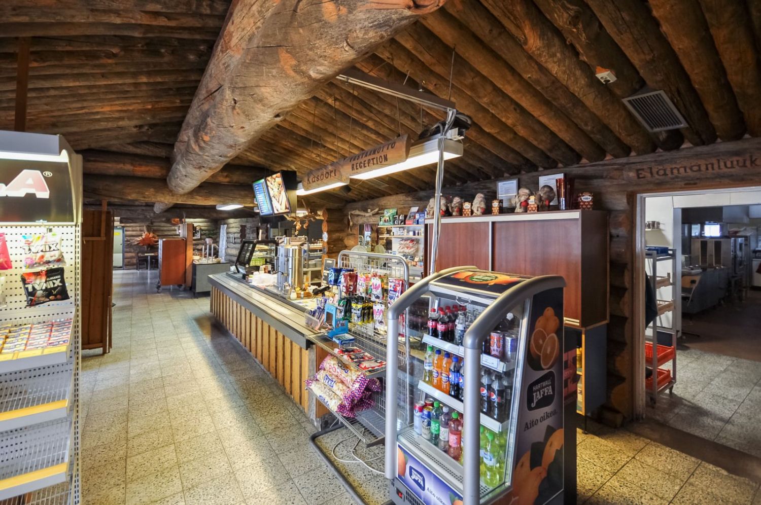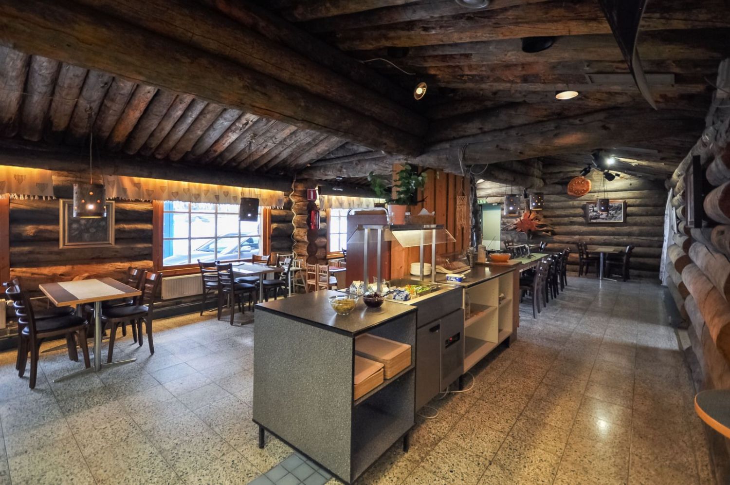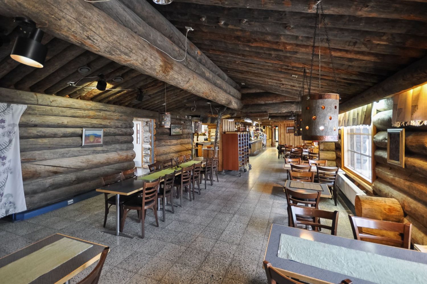 Hirsirakennus, paljas hirsi luo tunnelmaa läpi rakennuksen niin ruokailusalissa kuin saunassakin. Ammattilaistason keittiötilat.