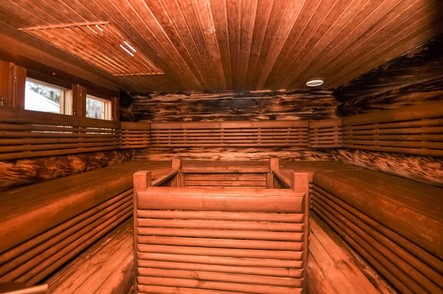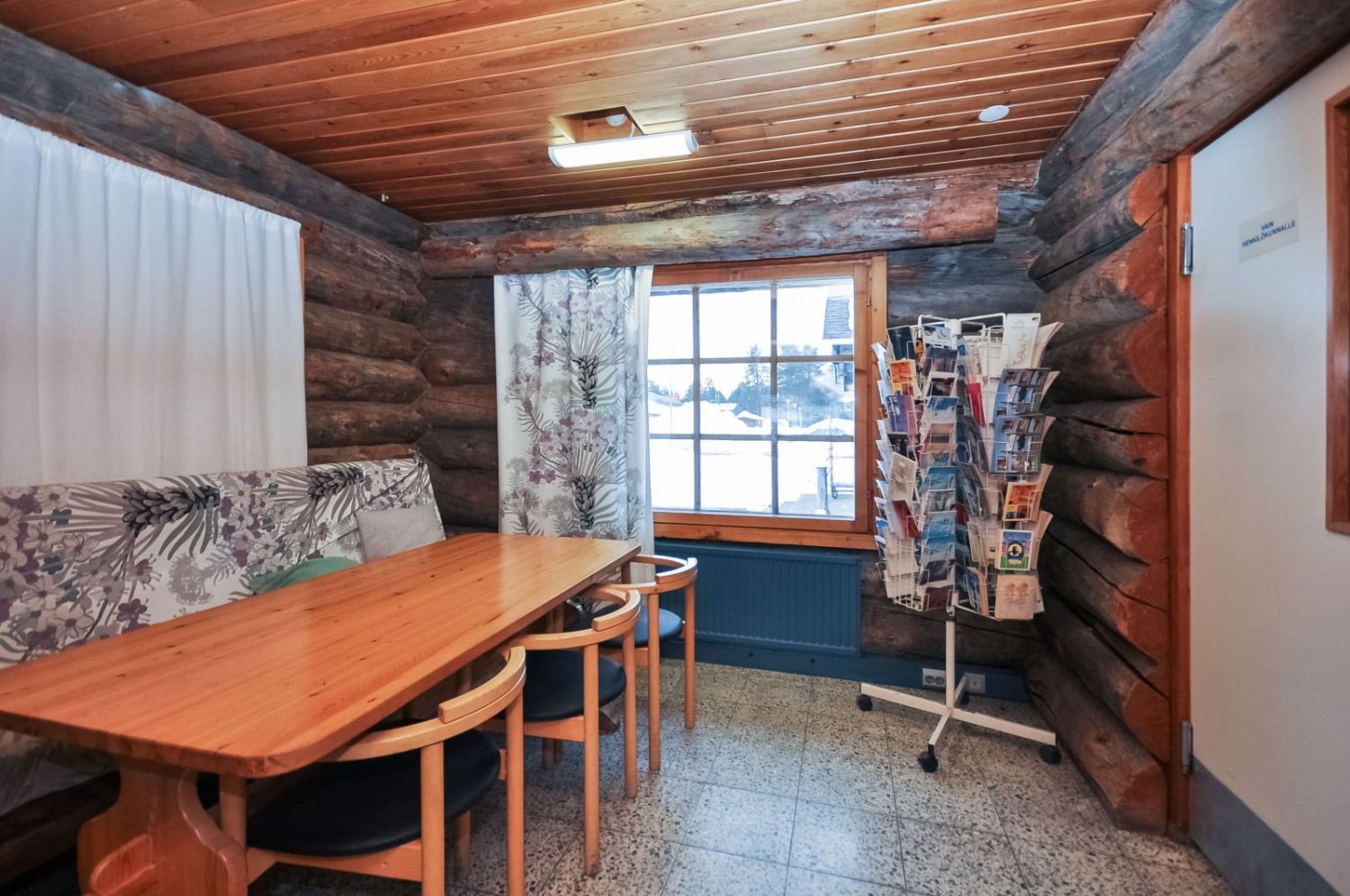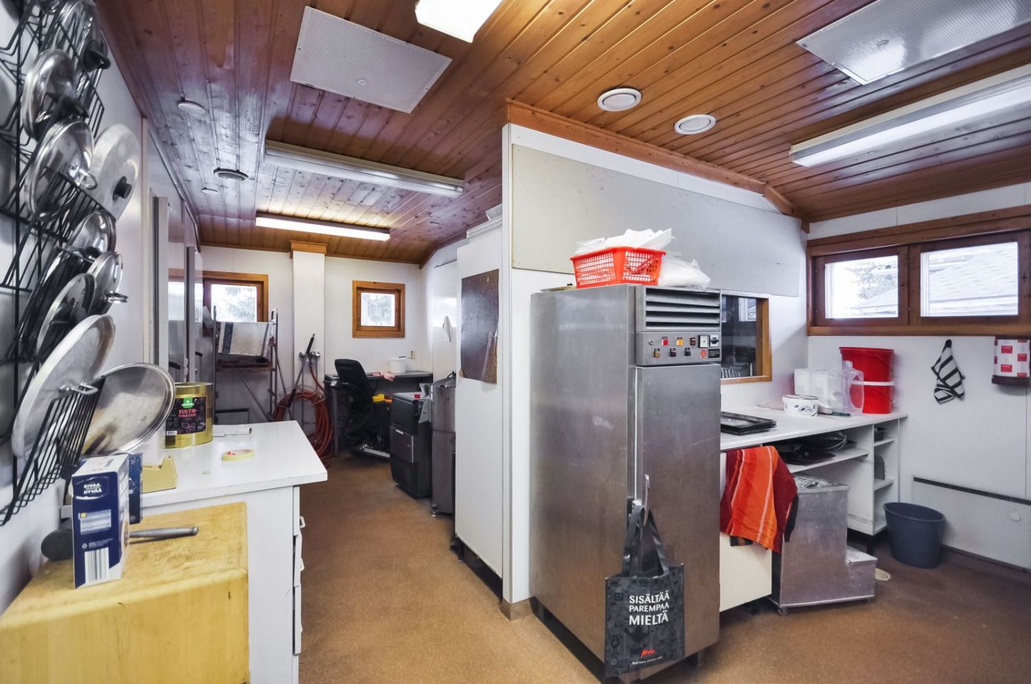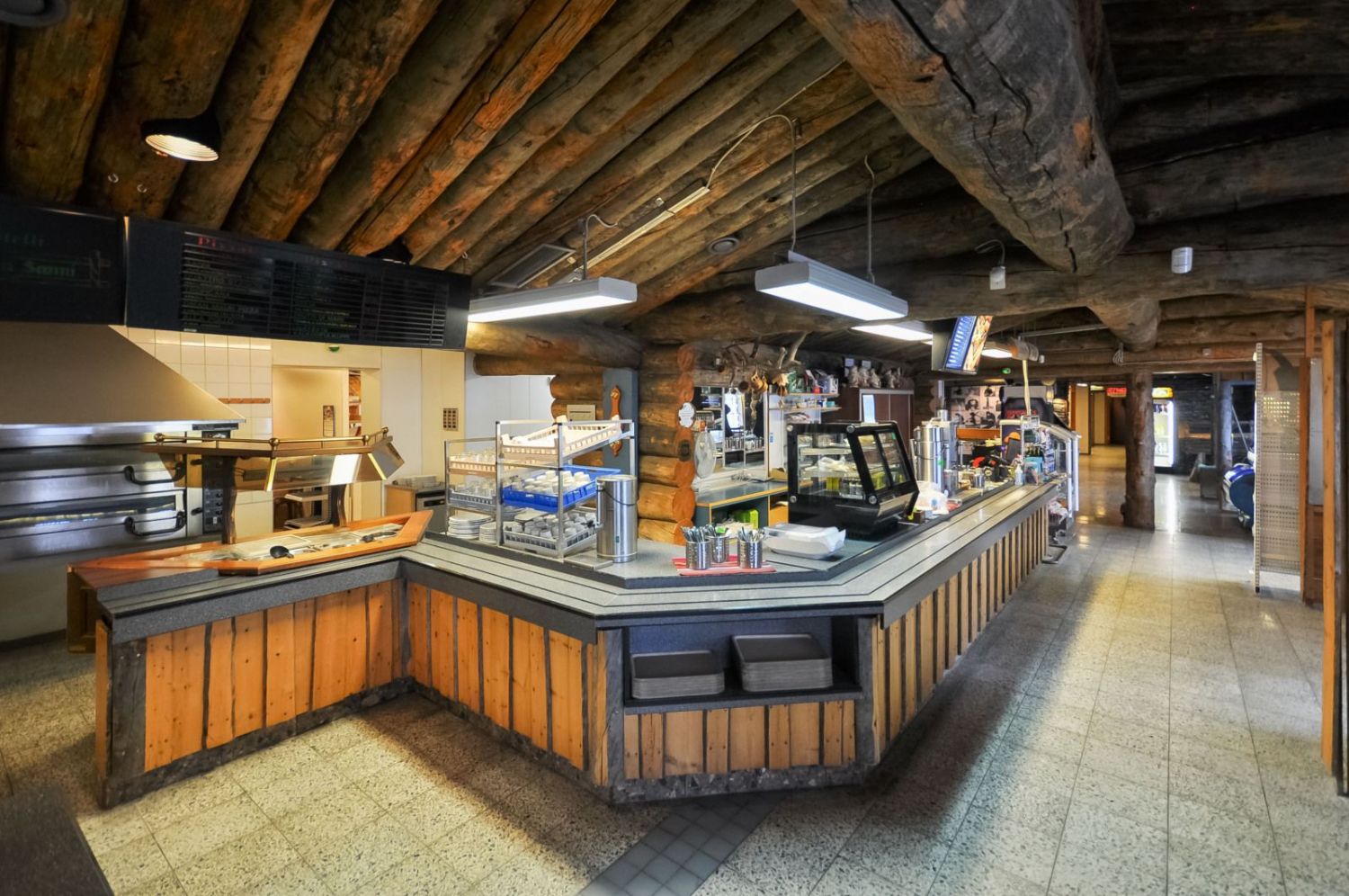 Hirsirakennus, paljas hirsi luo tunnelmaa läpi rakennuksen niin ruokailusalissa kuin saunassakin. Ammattilaistason keittiötilat.