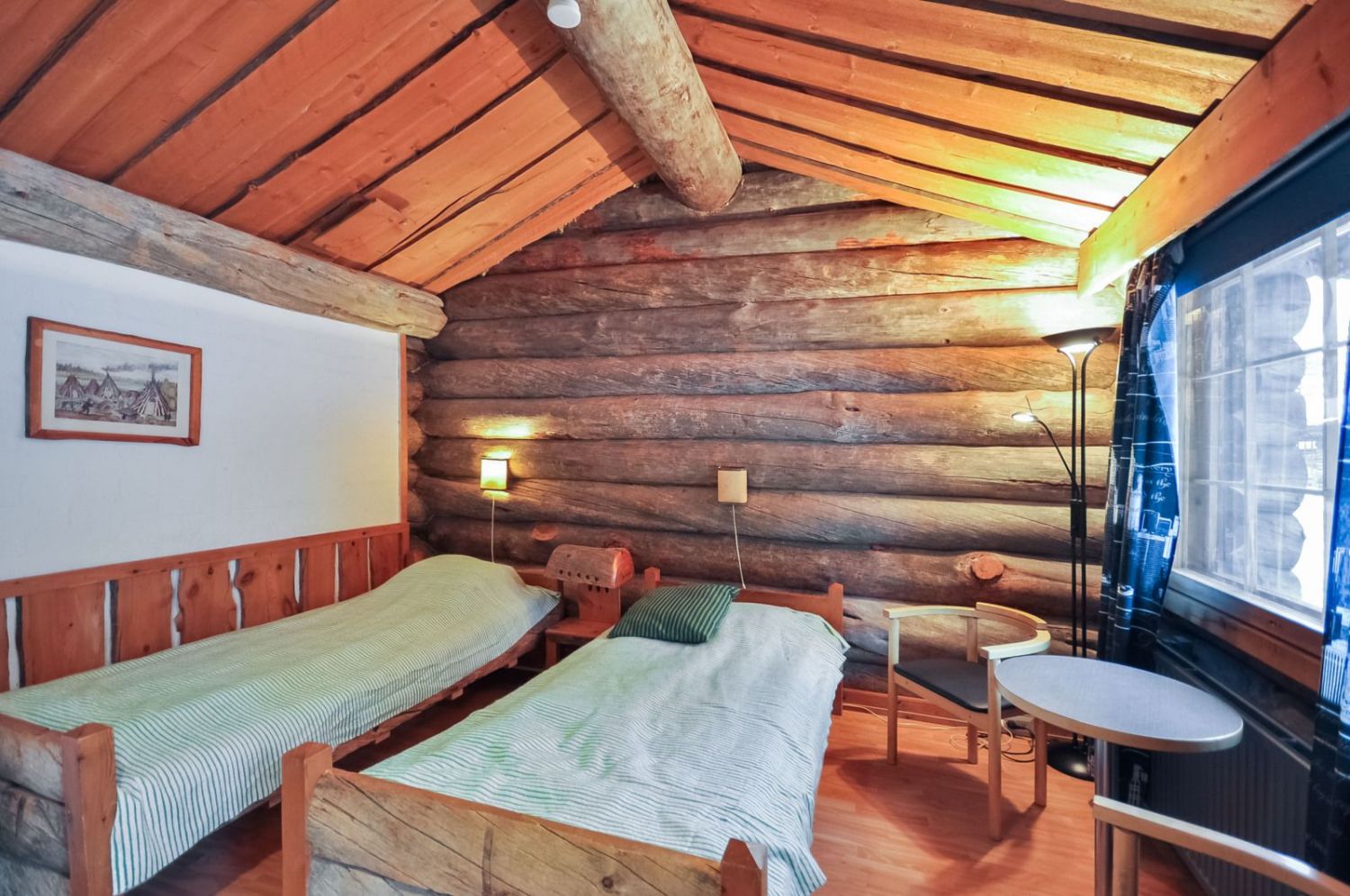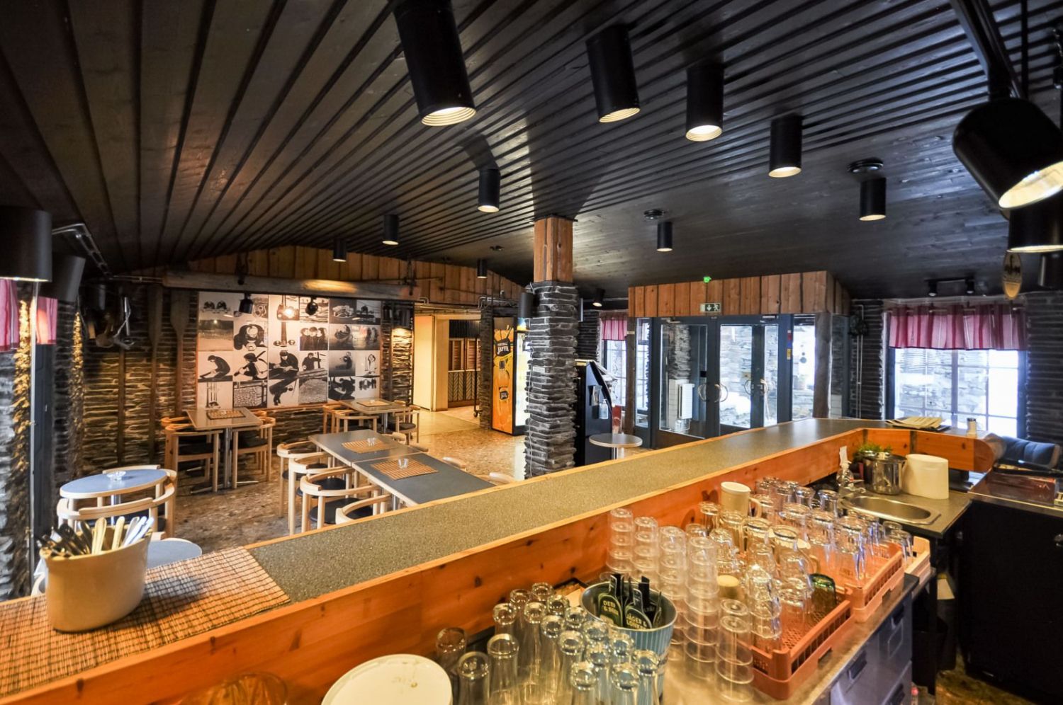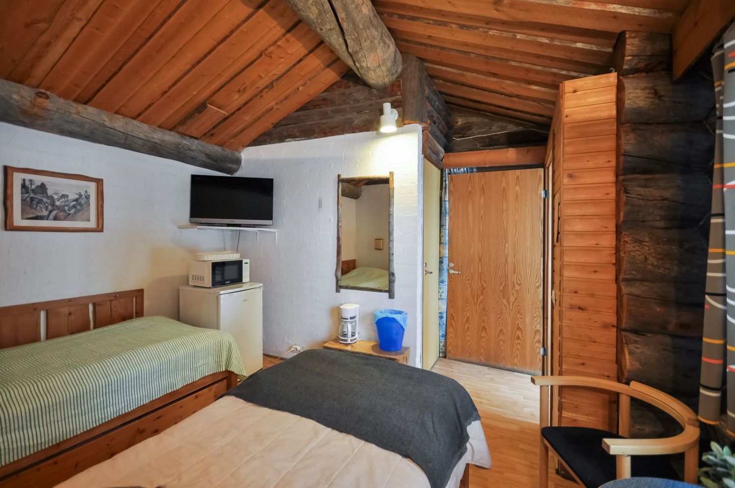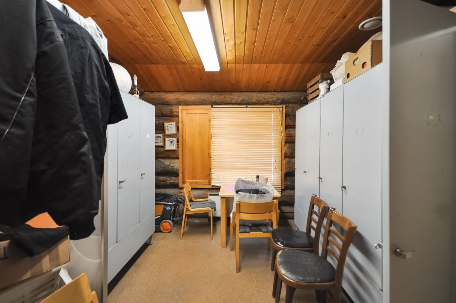 Hirsirakennus, paljas hirsi luo tunnelmaa läpi rakennuksen niin ruokailusalissa kuin saunassakin. Ammattilaistason keittiötilat.