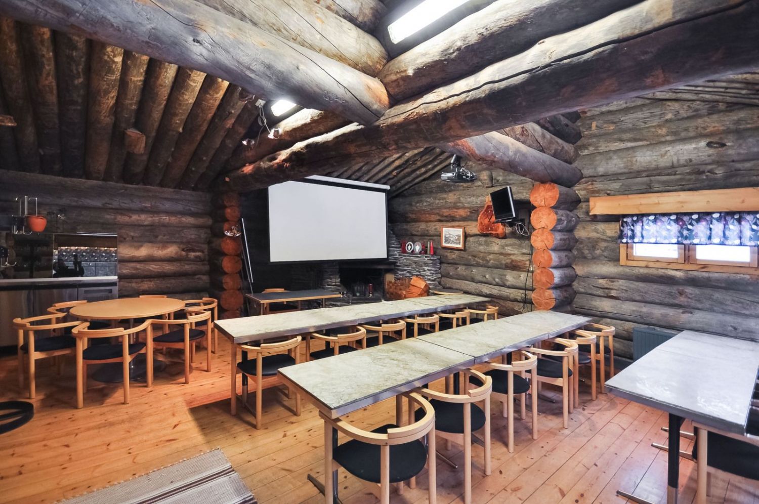Hirsirakennus, paljas hirsi luo tunnelmaa läpi rakennuksen niin ruokailusalissa kuin saunassakin. Ammattilaistason keittiötilat.
