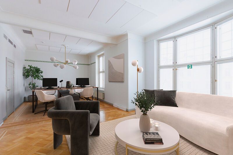 Erittäin siisti toimistokokonaisuus jossa korkeat sekä valoisat huoneet ja isot ikkunapinnat. Tyylikkäät yksityiskohdat, kuten kakluunit sekä erikoisparketti tuovat tilaan historian henkeä. Erinomainen sijainti lähellä keskustan palveluita.