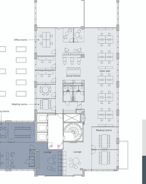 Viidennen kerroksen valoisa toimistotila, josta aukeaa näkymä suoraan Triplaan. Toimistossa on avotilaa, tiimi- ja neuvotteluhuoneita ja pienempiä työhuoneita. Tilaa on mahdollista muunnella vuokralaisen tarpeiden mukaan.