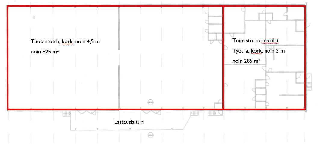 Hallitilaa noin 825 m2 ja toimisto- ja sosiaalitiloja sekä matalampaa työ- ja varastotilaa noin 285 m2.