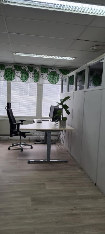 Siistiä 2. kerroksen toimistoa. Tilassa 3 ovellista toimistohuonetta ja 6 sermein rajattua toimistotilaa, sekä 2 wc:tä. Tämän lisäksi erillisellä sisäänkäynnillä oleva iso keittiö ja sielläkin kaksi wc:tä, joissa molemmissa on suihkut.