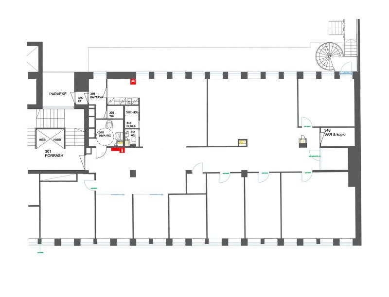 Tila koostuu avoimesta tilasta, valoisista toimistohuoneista sekä lasiliukuovilla varustetuista huoneista. Ikkunat kävelykadun sekä sisäpihan suuntaan.