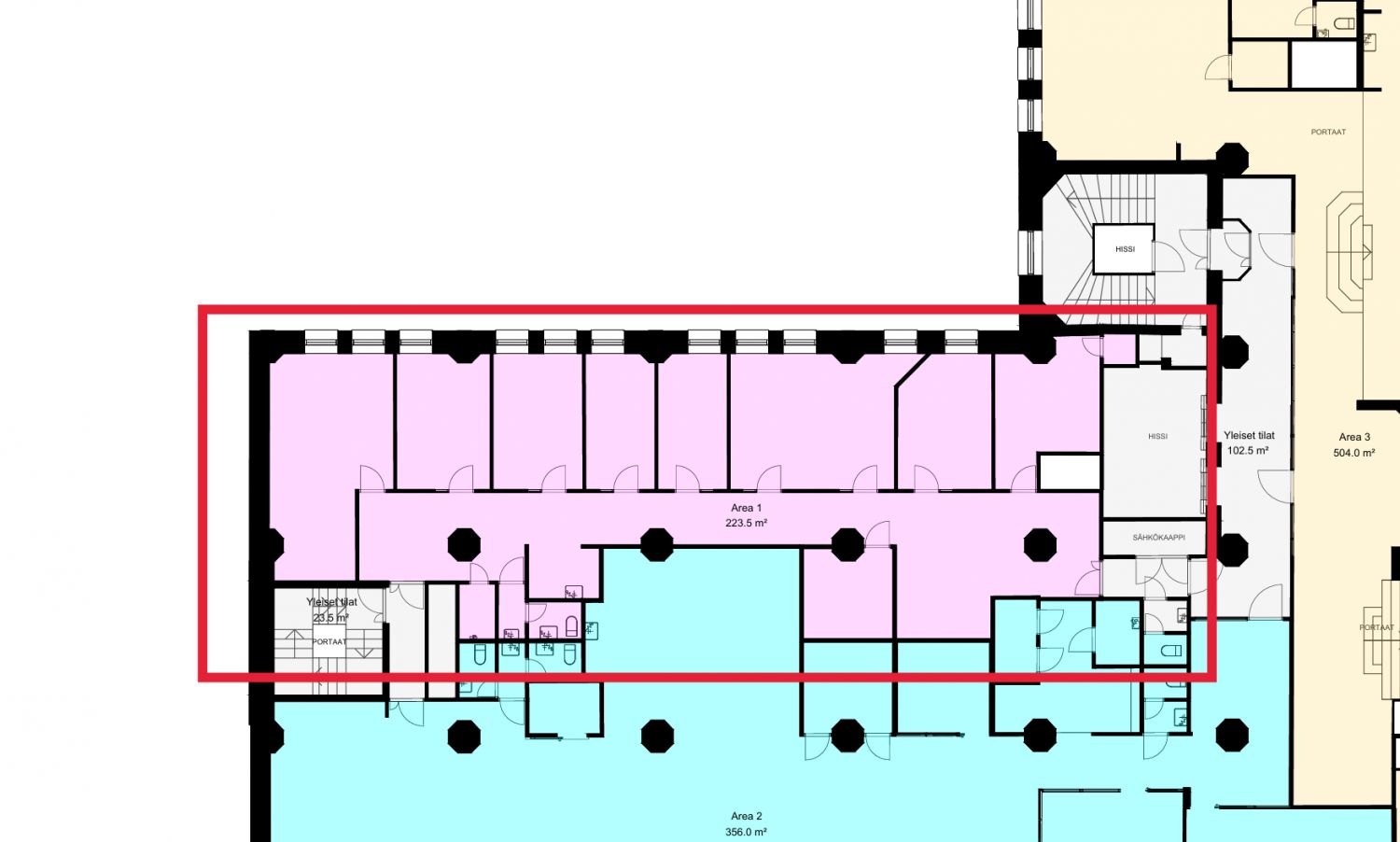 Tämä toisen kerroksen toimisto tarjoaa viihtyisät tilat yrityksenne toiminnalle. Huoneisto koostuu useista erillisistä työhuoneista, tarjoten yksityisyyttä keskittymistä vaativaan työskentelyyn. Päivän kulkua sujuvoittavat oma minikeittiö sekä wc-tilat. Tiloja voidaan muokata vastaamaan paremmin tarpeitanne.