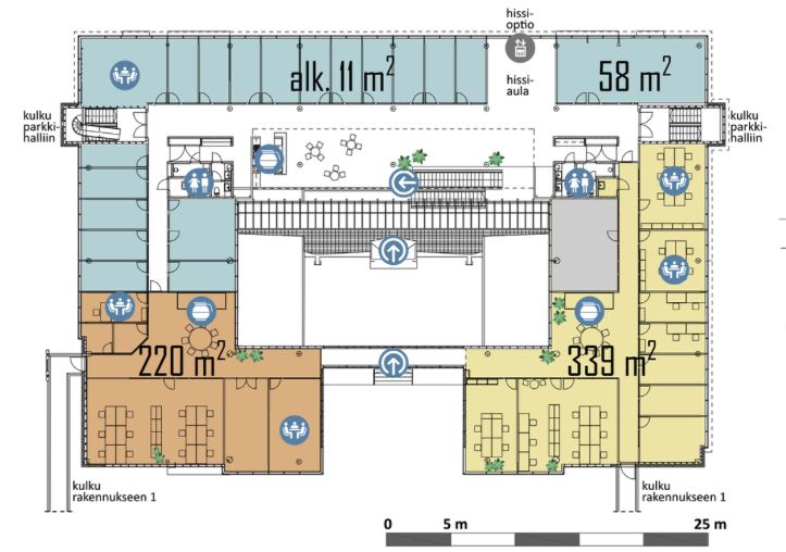 Tämä 339m2 toimistotila sijaitsee kiinteistön 2. kerroksessa. Tilat ovat muokattavissa tulevan vuokralaisen tarpeiden mukaan. Seiniä on mahdollista purkaa tarvittaessa. Kuvat ovat yleiskuvia kiinteistön tiloista.