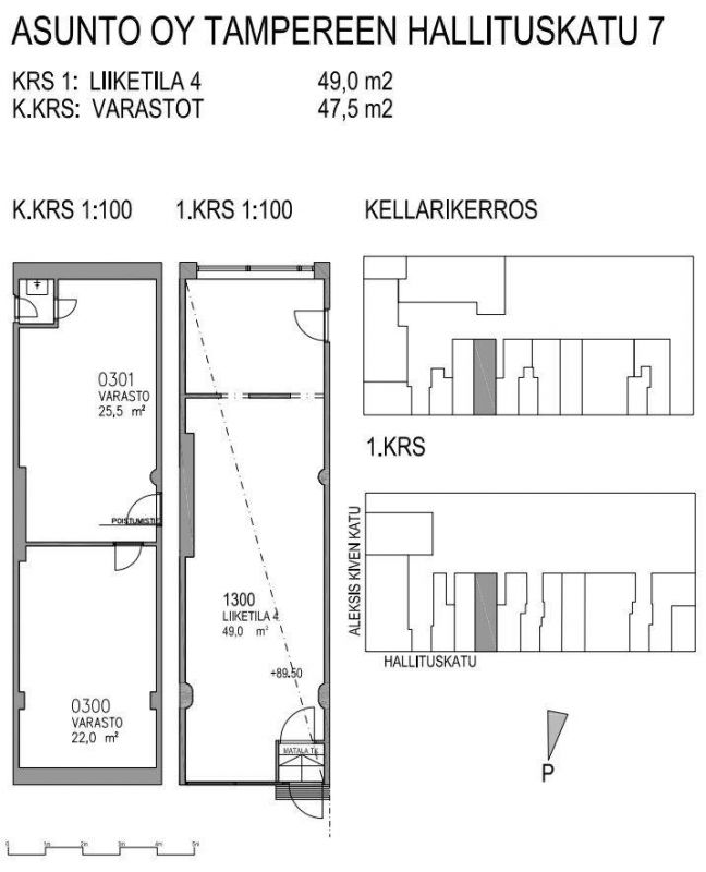 Katutasossa 49 m2 ja alakerrassa tilaa 47,5 m2. Kokonaispinta-ala 96,5 m2.