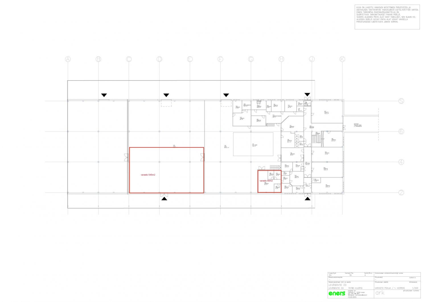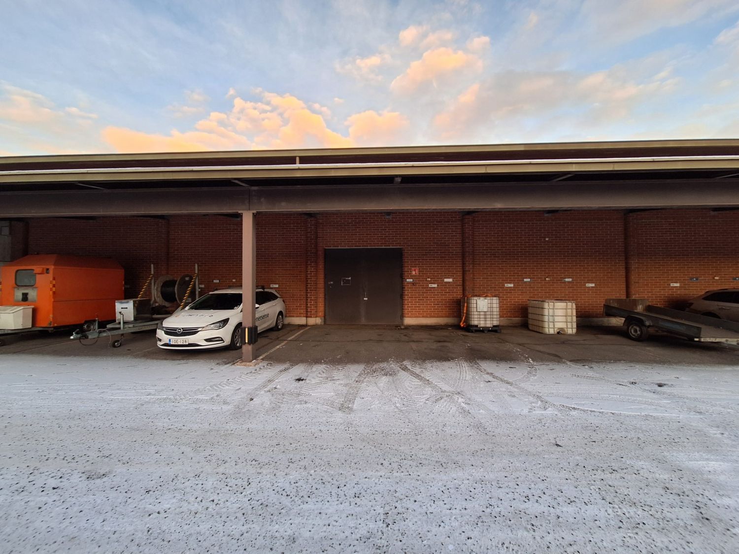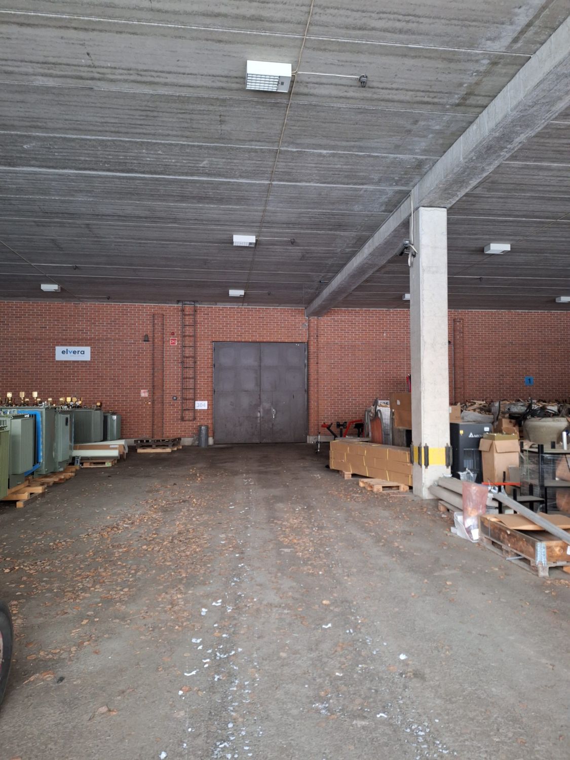 Hallilohko erotettu toisesta lohkosta pressulla/verkolla. Vapaa korkeus noin 5 metriä, tavarat saa sisään korkeasta pariovesta 3,5 x 4 m (l x k). Hallin yhteydessä ulkokatoslohko noin 144 m2.