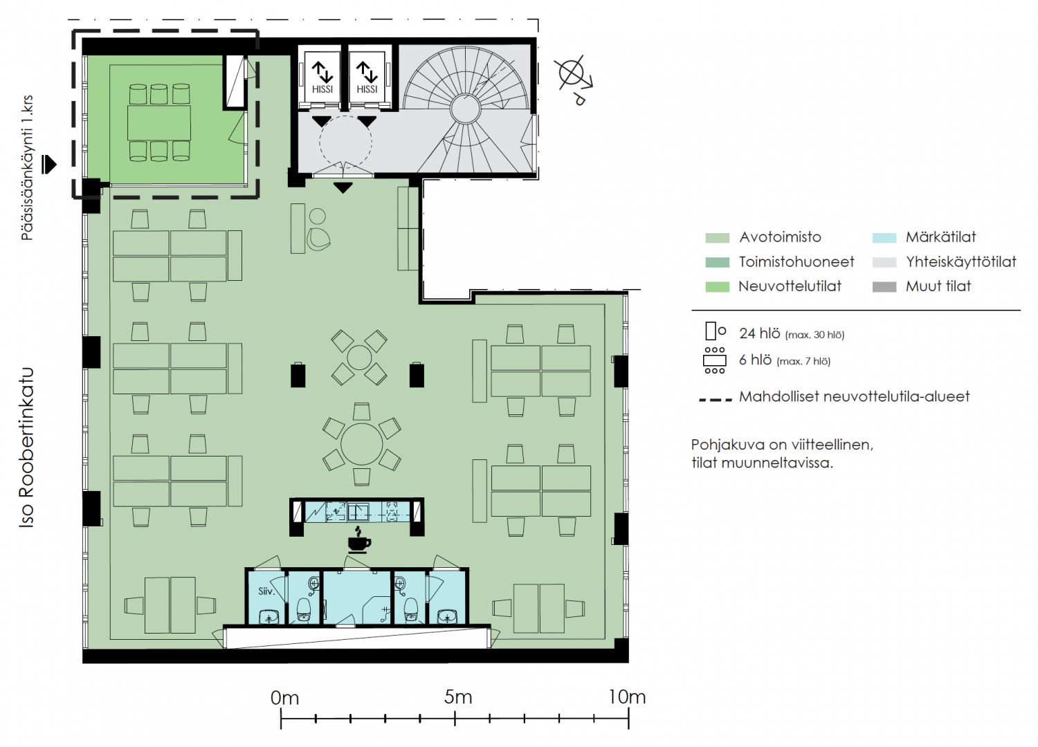 Tilat sopivat keskeistä sijaintia sekä tehokkaasti toteutettuja neliöitä etsivälle yritykselle. Muuntelukelpoiset tilat voidaan toteuttaa yrityksen tarpeiden mukaisesti. Kiinteistössä on vuokrattavissa toimistotilaa 3 380 m² ja liiketilaa 769 m². Lisäksi pohjakerroksesta on mahdollista vuokrata varastotiloja.
