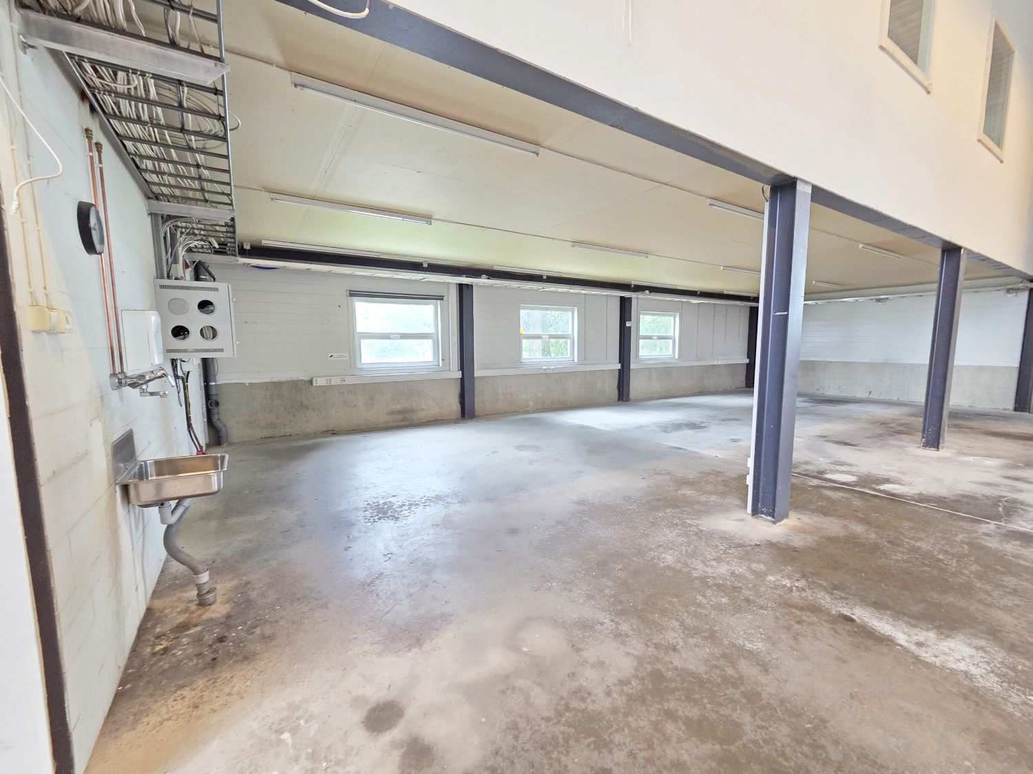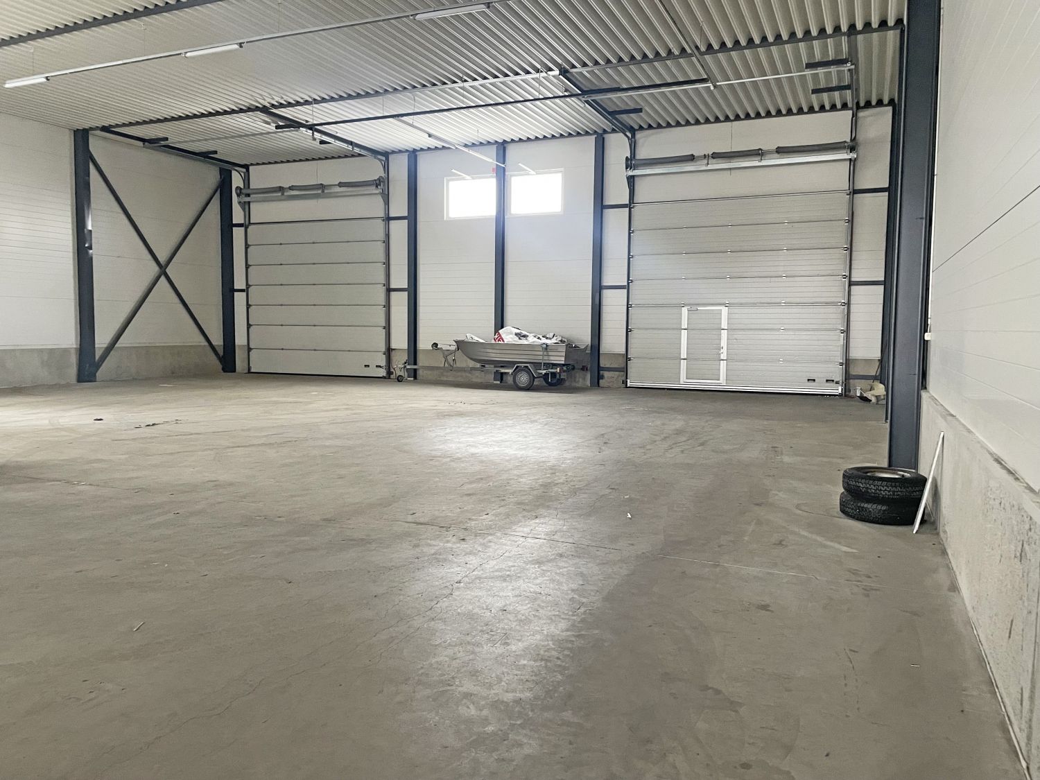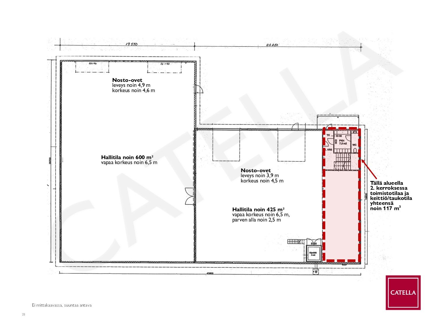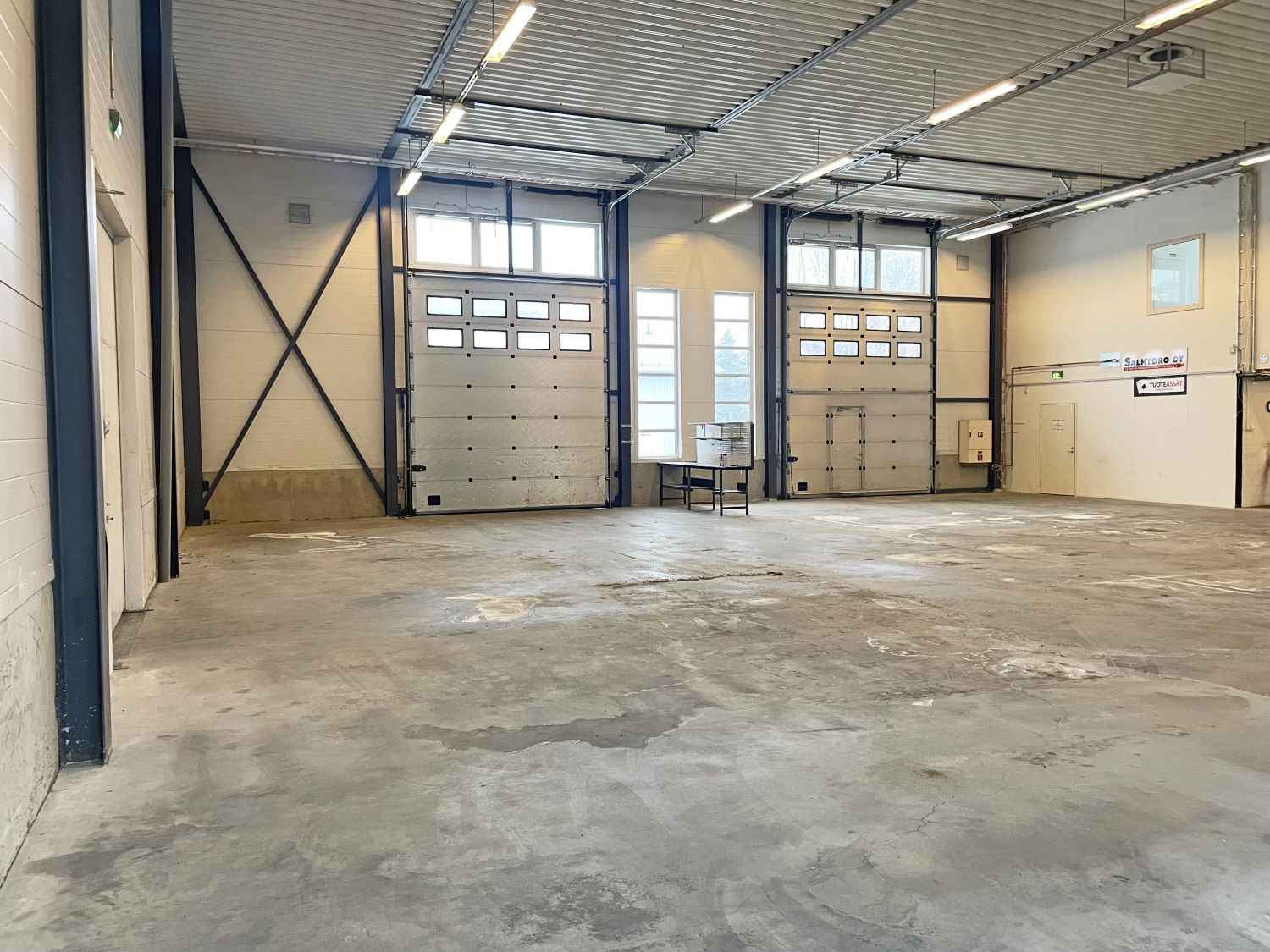 Tila jakautuu kahteen hallilohkoon joiden välillä on pariovet. Molempiin hallilohkoihin kaksi nosto-ovea. Ovien koot merkitty pohjakuvaan. Ei lattiakaivoja.