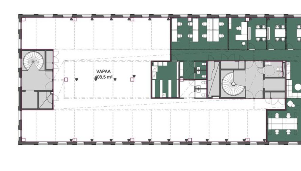 Tämä 408 m² toimistotila sijaitsee kiinteistön 5. kerroksessa. Tila on mahdollista toteuttaa avotilan ja huoneiden yhdistelmänä vuokralaisen tarpeen mukaan. Myös keittiö rakennetaan uudelle käyttäjälle. Tilan ikkunat tuovat tilaan runsaasti luonnonvaloa. Tilassa on industriaalinen ja loft-henkinen tunnelma.