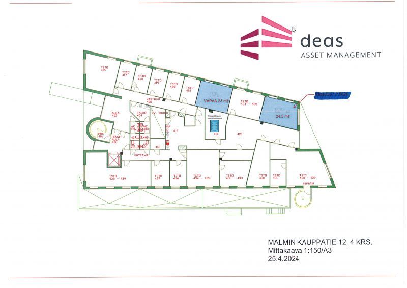 Vuokrataan 4. kerroksen pientoimistoalueelta 24, m²:n valoisa toimistotila.