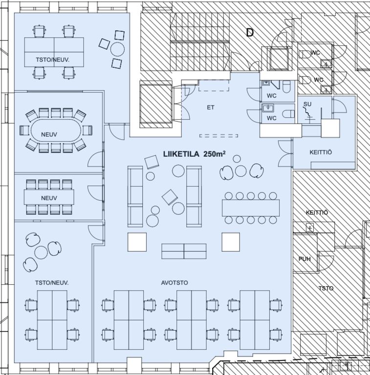 Tämä 250 m² toimistotila sijaitsee kiinteistön 5. kerroksessa. Toimistossa on avotilaa sekä yksittäisiä työ-/neuvotteluhuoneita, taukotila sekä omat wc-tilat ja suihku. Koneellinen poistoilmanvaihto. Sähkö kulutuksen mukaan.