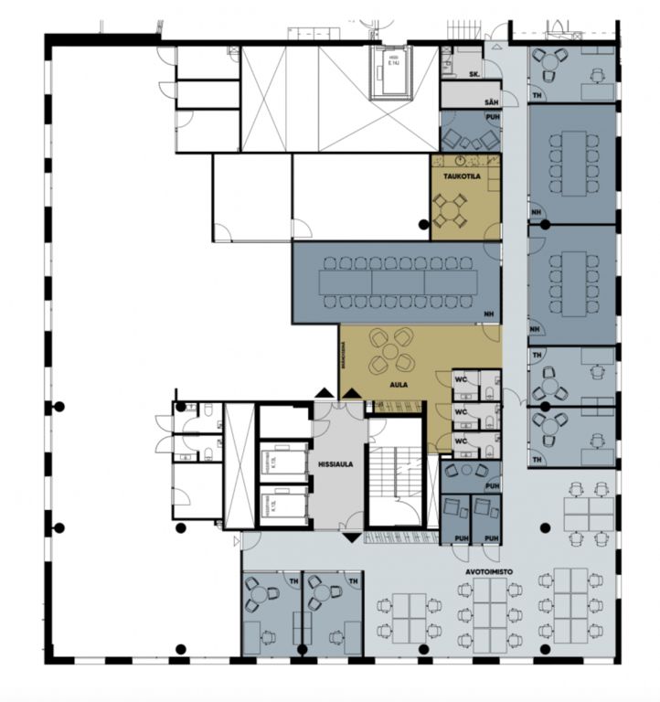 Tämä 383m² toimistotila sijaitsee kiinteistön 5. kerroksessa. Tilassa on tällä hetkellä erikokoisia neuvotteluhuoneita, toimistohuoneita sekä avotoimistoa.
