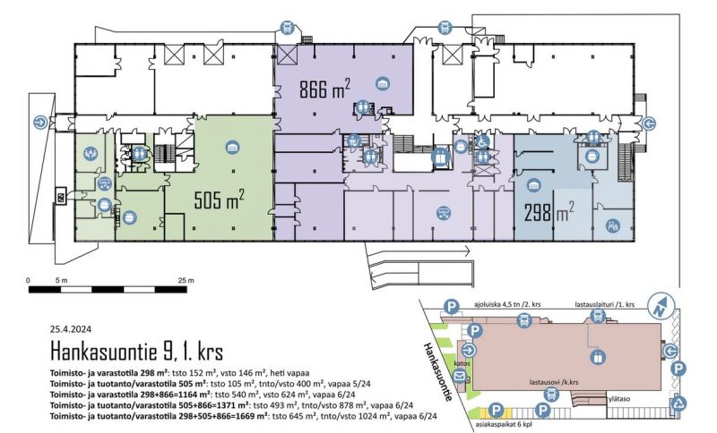 - tilajako: toimisto 645 m², varasto 1024 m²