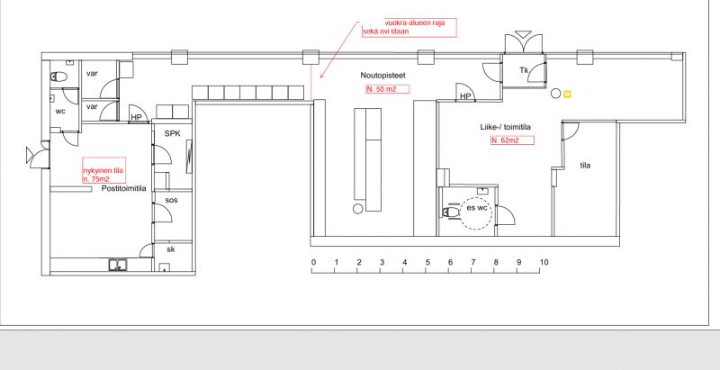 Tilaan voidaan yhdistää myös viereinen 50 m2 tila, ks pohjakuva.