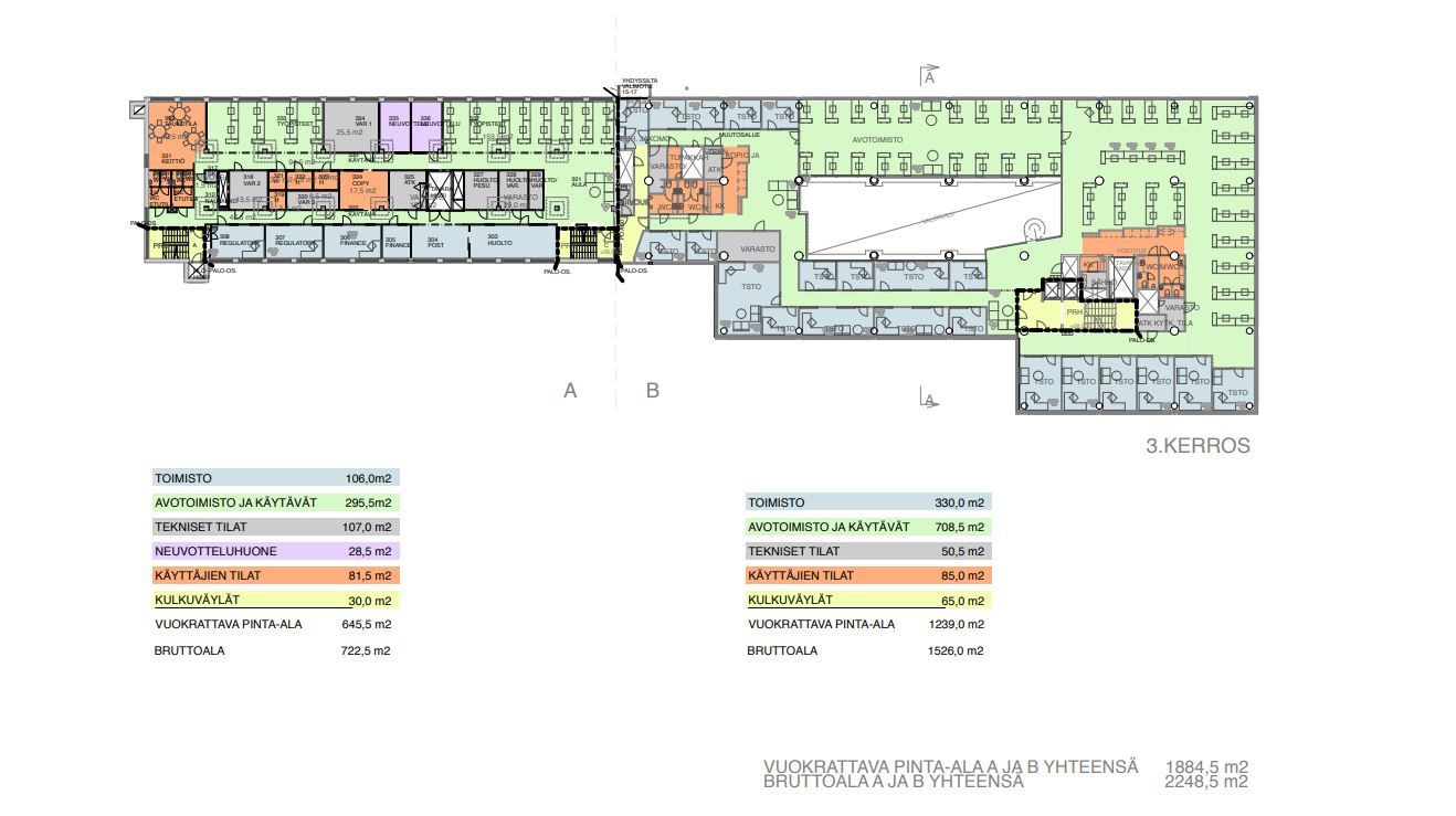 Tehokkaita ja nykyaikaisia tilaratkaisuja Pitäjänmäessä. Vuokrattavissa kolmannen kerroksen toimistotila 616 m2. Ohessa koko 3. kerroksen pohjakuva.