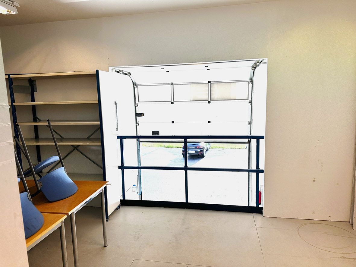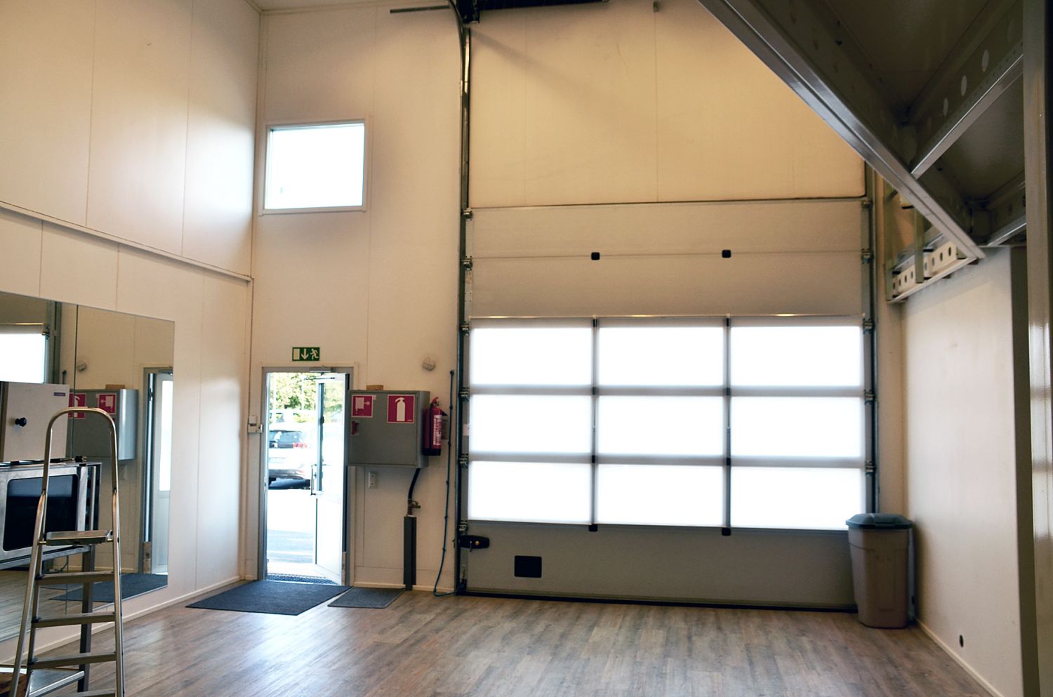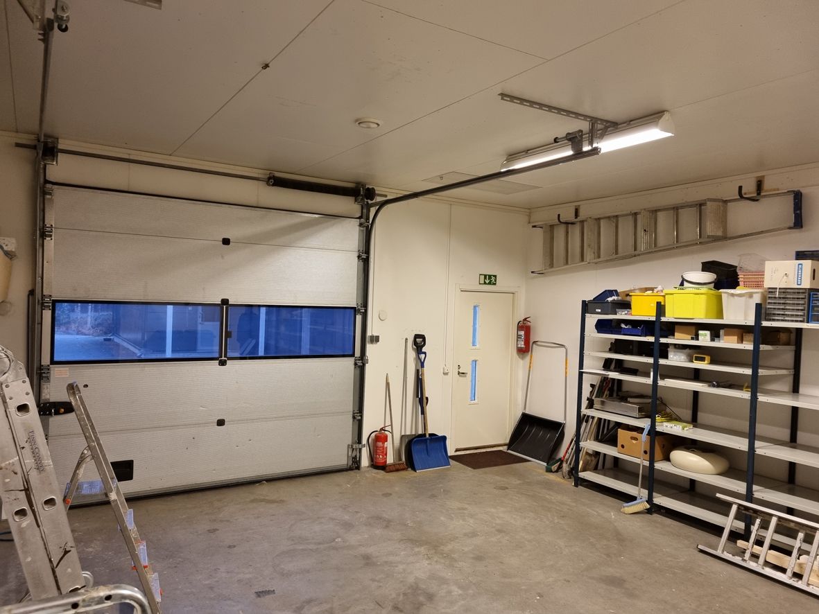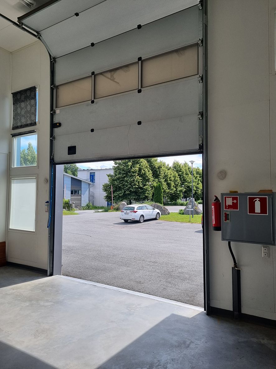 Nosto-ovet 3 kpl, 3,5 x 3,5 metriä, sekä yksi pienempi varastoon, kulkuovet kaikissa tiloissa.