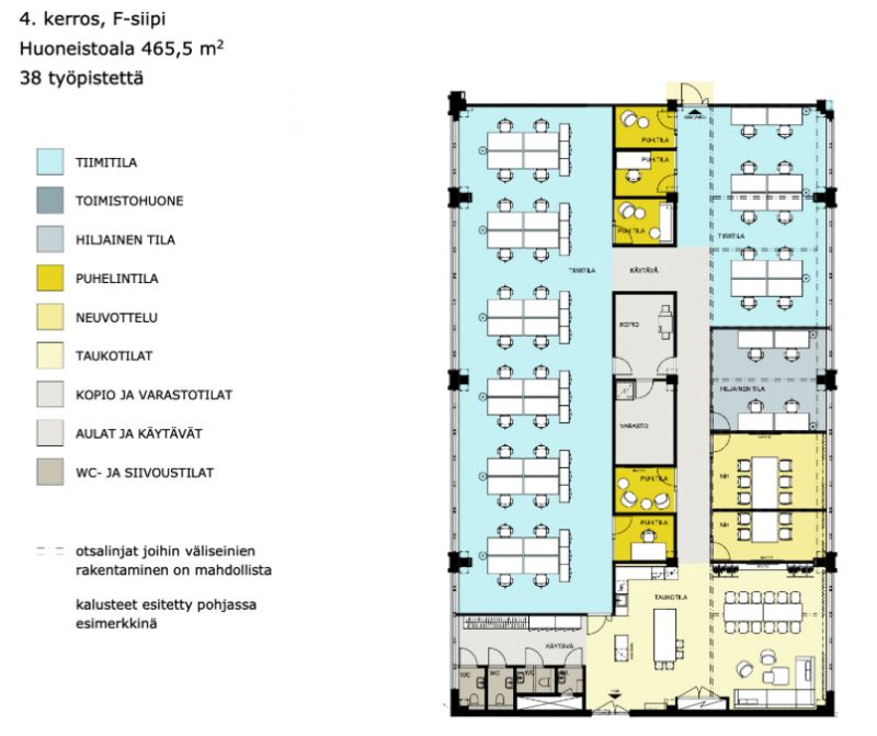 Toimistotila sijaitsee kiinteistön 4 kerroksessa. Tilassa on nykyjaolla: