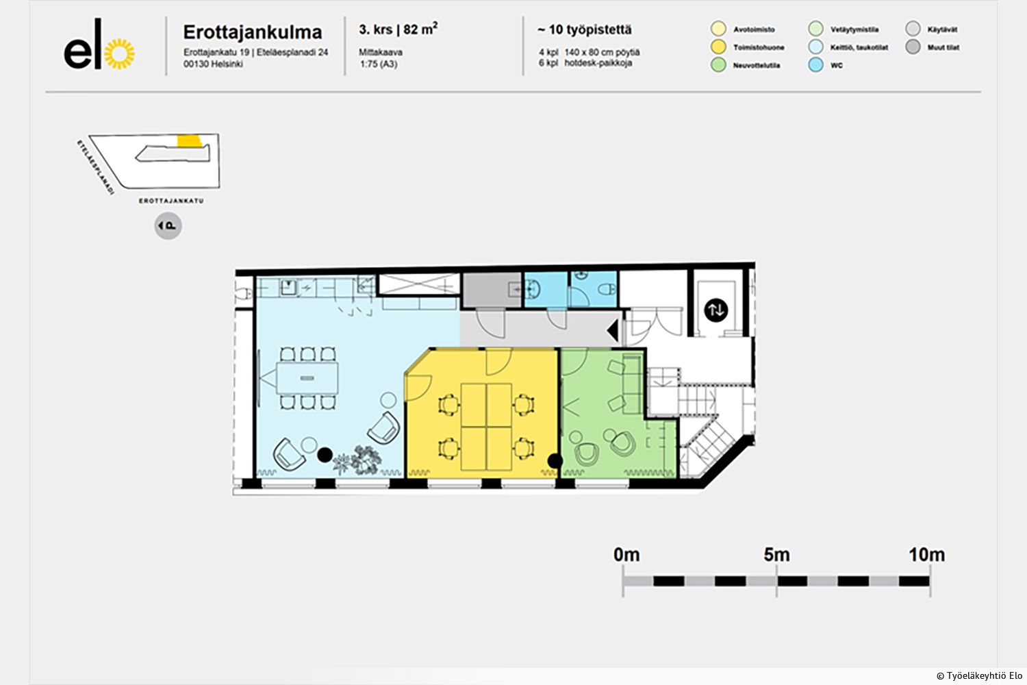 Toimistotilaa arvokiinteistössä Helsingin ydinkeskustassa. Helsingin keskustan kolmen pääakselin – Mannerheimintien, Esplanadin ja Bulevardin – risteyksessä sijaitseva Erottajankulma suunniteltiin palatsimaiseksi asuin- ja liikerakennukseksi. Vuonna 1893 vuonna valmistunut arvokiinteistö on täynnä koristeellisia ja pysäyttäviä yksityiskohtia. Rakennuksen upean korosteelliset porrasaulat ja julkisivut on kunnostettu alkuperäistä ulkoasuaan kunnioittaen. Kiinteistöä ja toimitiloja muokataan asiakkaiden tilatarpeita vastaavaksi ja hyödyntäen nykyaikaista talotekniikkaa, mm. jäähdytetyn ilmanvaihdon osalta. Kiinteistön viihtyisä sisäpiha tarjoaa hengähdyshetken koristekirsikkapuiden varjossa. Kiinteistössä on toimistotiloja, liiketiloja sekä ravintola.