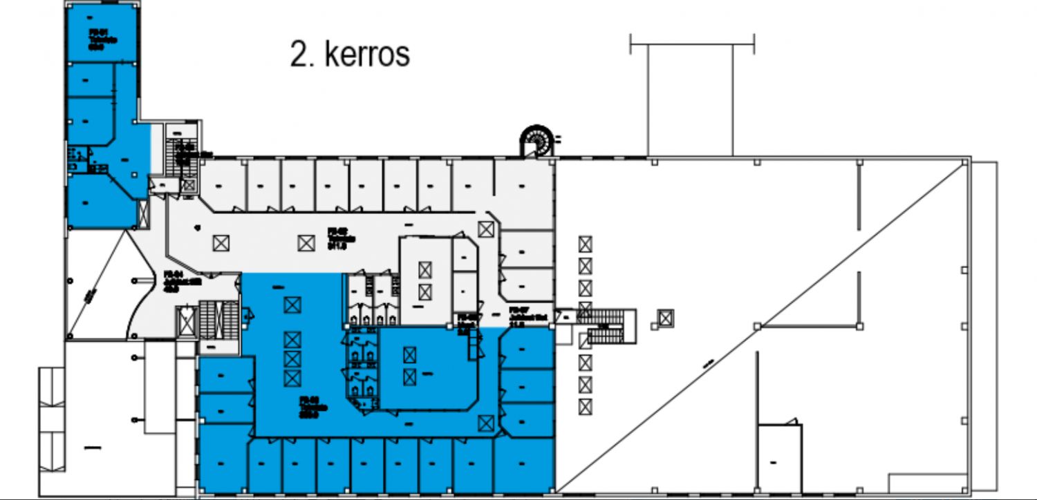 Vuokrattavana toisen kerroksen toimistotilaa. Toimistossa on useita huoneita.