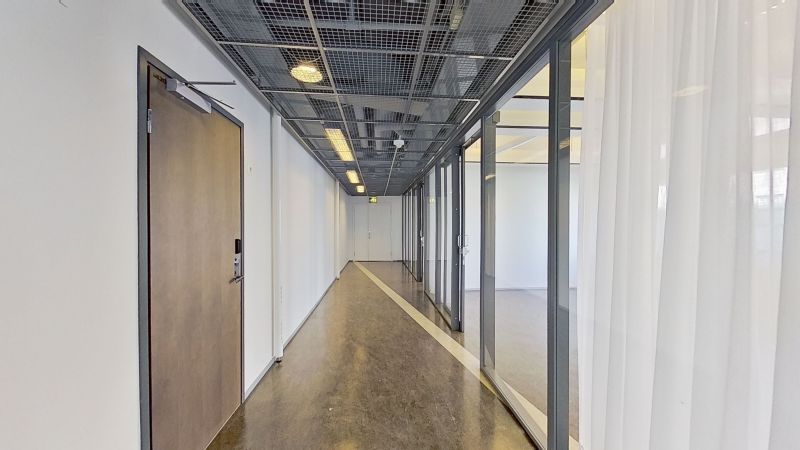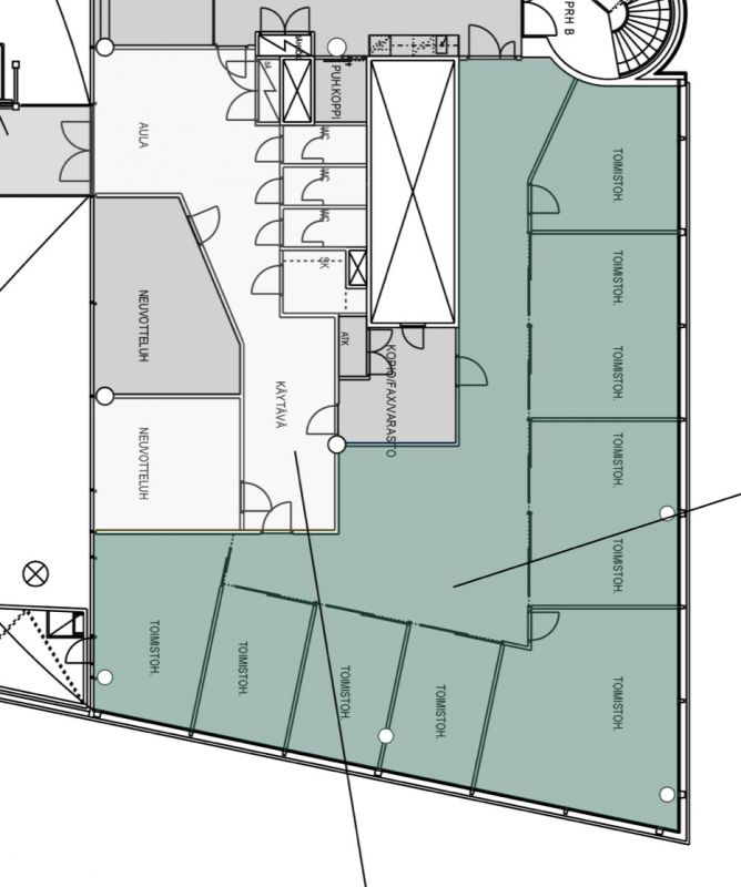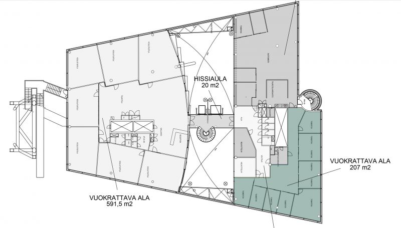 Kolmannen kerroksen toimistotila jossa on erikokoisia toimistohuoneita.