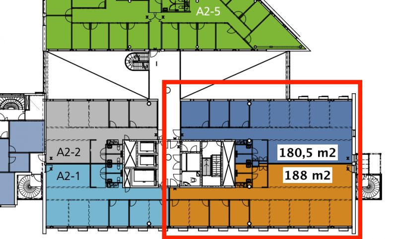Toisen kerroksen toimistotila 368,5 m2 joka on mahdollista jakaa myös kahdelle käyttäjälle. Toimistotilassa on nykyjaolla: