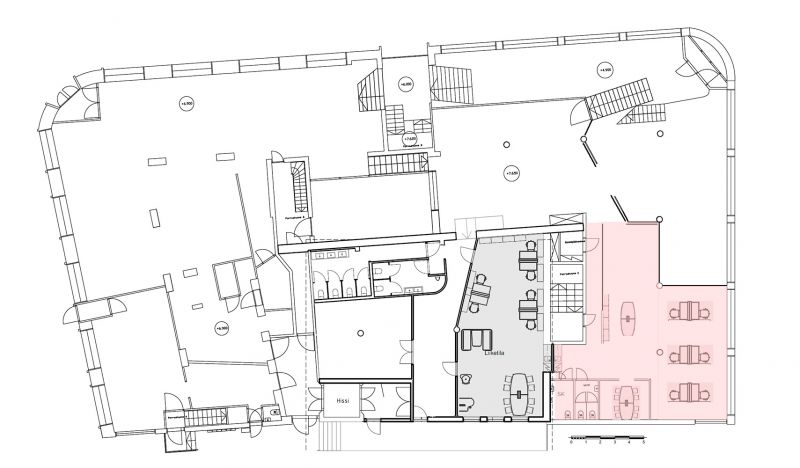 Vuokrattavana tyylikäs toimitila kauppatavaratalon toisesta kerroksesta. Tilaan kulku tavaratalon kautta tai rakennuksen takaoven kautta. Soveltuu toimistoksi tai yrityksen showroomiksi. Tila on pohjakuvassa punaisella merkitty alue ja se on yhteensä 95 m².