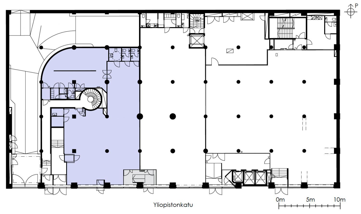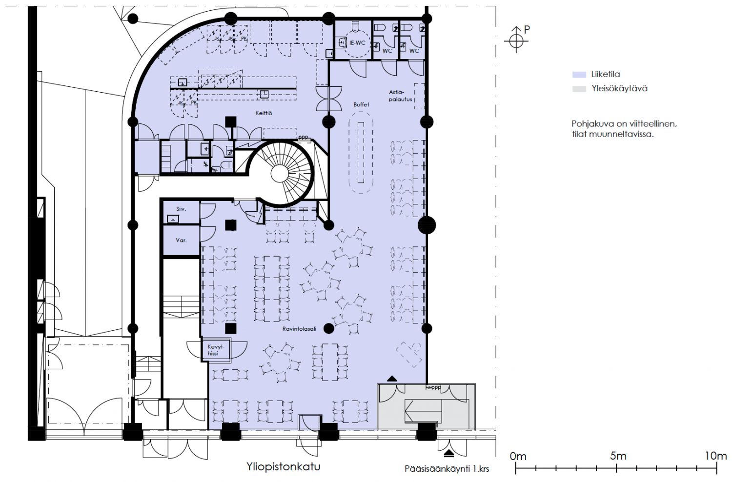 Ravintolatila vilkkaalla Yliopistonkadulla. Liiketilassa on kaksi sisäänkäyntiä. Omistaja toteuttaa kohteessa peruslaatutason remontin. Pohjakuvan tilasuunnitelma on suuntaa-antava.