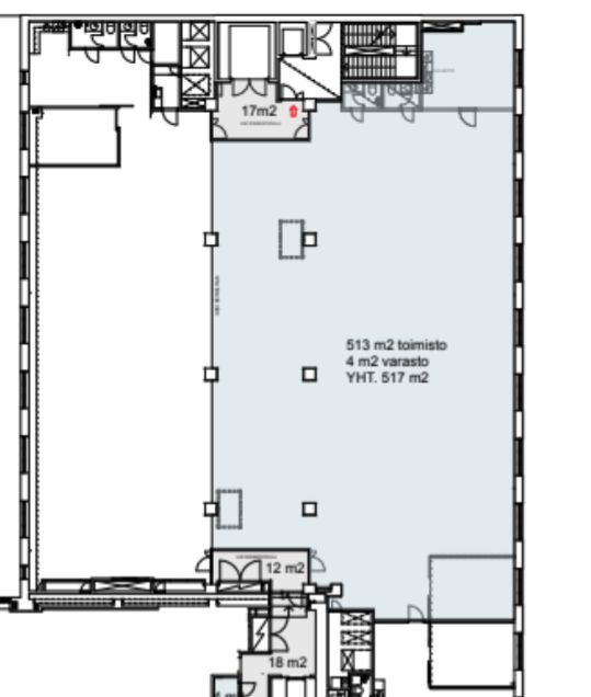 Tämä 514m2 toimisto on pääosin avonainen, ja siihen kuuluvat omat keittiö- ja wc-tilat. Tilaan on tavarahissiyhteys. Ikkunat ovat Teurastamon suuntaan. Tila on mahdollista jakaa kahdelle käyttäjälle.