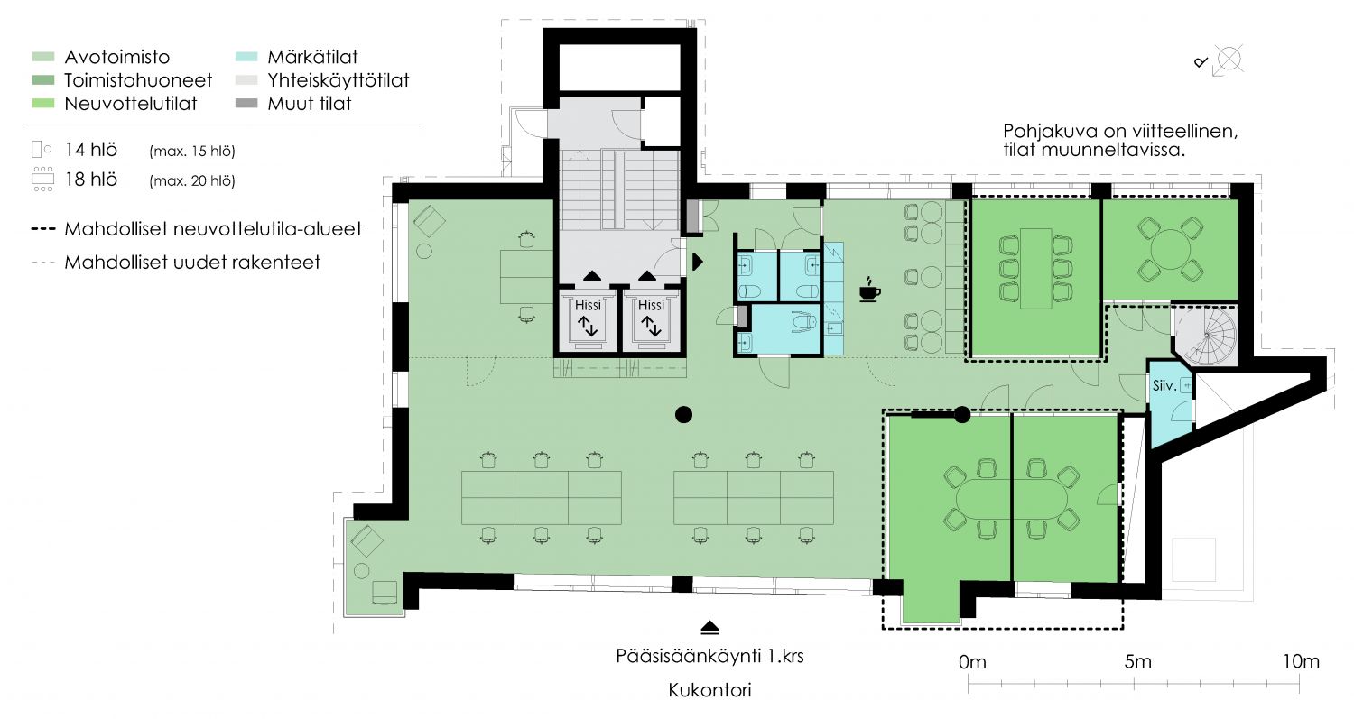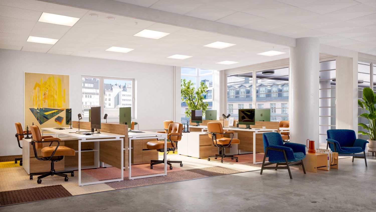 Ylimmän kerroksen siisti ja valoisa toimistotila Forumin sydämessä. Ikkunanäkymät Kukontorille.