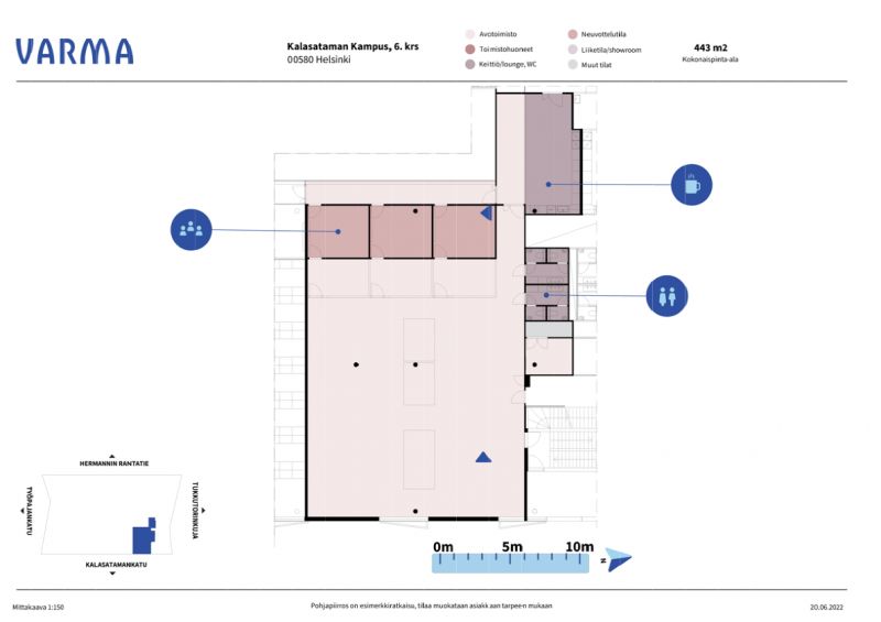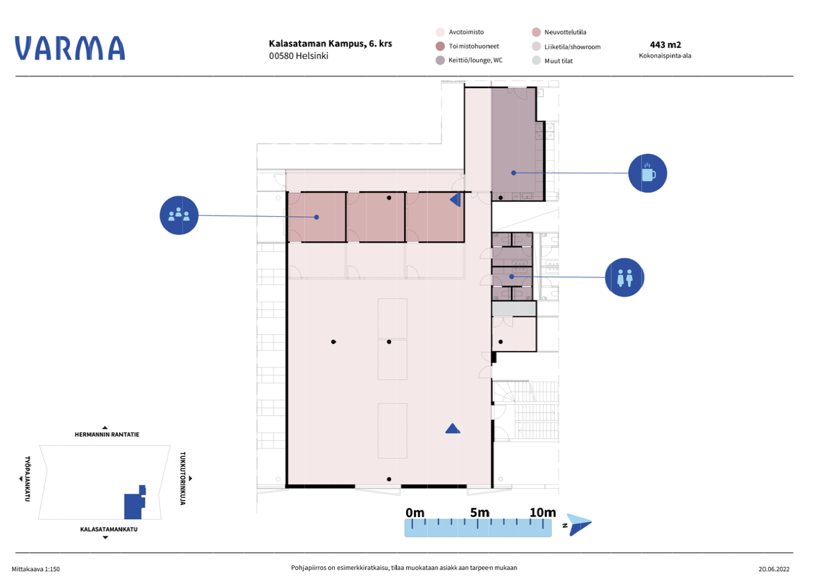 Vetovoimaisen Kalasataman keskiössä sijaitsevassa toimistotalossa henkilöstö saa irti kaikki hyödyt metron nopeista yhteyksistä sekä Kauppakeskus Redin tarjonnasta. Kampukselta kävelee näihin vain muutaman minuutin.