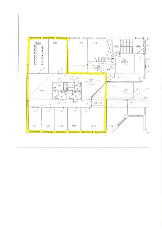 Huoneisto asemoituu keskustan puoleiseen päätyyn. Työhuoneita on 7kpl ja avotilaakin löytyy.