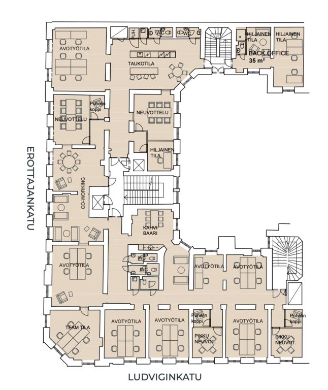 Tämä 505m² tila sijaitsee kiinteistön 4. kerroksessa. Tilasta on näkymät Erottajalle sekä Ludviginkadulle. Kerros pitää sisällään monipuolisesti tiloja avokonttorista co-working-tiloihin tai vetäytymiseen. Vapautuminen keväällä 2026.
