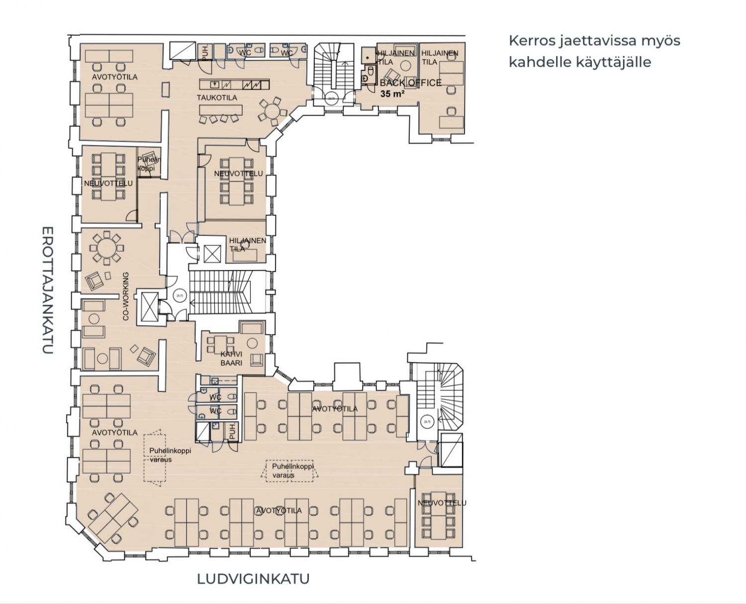 Vuokrataan 5. kerroksen 528m2 toimistotila huippupaikalla. Tämä upea toimitila tarjoaa yrityksellesi koko kerroksen käyttöön Helsingin arvostetulla Erottajankadulla. Tila sijaitsee historiallisessa ja hyvin hoidetussa kiinteistössä, yhdistäen arvokkaan vanhan ajan tunnelman ja modernit toimistoratkaisut. Avarat ja valoisat tilat mahdollistavat monipuoliset käyttötarkoitukset ja muunneltavissa olevat pohjaratkaisut, jotka voidaan räätälöidä juuri yrityksesi tarpeisiin. Kerros voidaan jakaa kahdelle käyttäjälle.