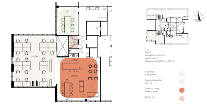 217,4 m² toimisto + 11,6 m² jyvityksiä yhteisistä tiloista.